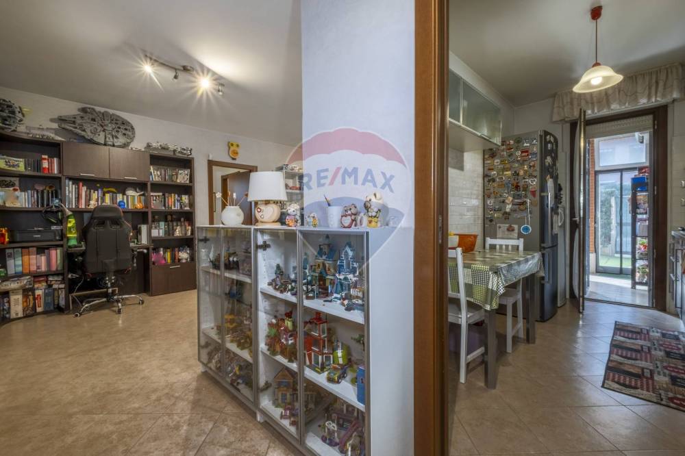 Troviamo poi la cucina separata, che offre spazio sufficiente per cucinare in comodità, e la sala da pranzo verandata, un ambiente accogliente e luminoso che si apre anch'esso sul giardino, creando una continuità perfetta tra interno ed esterno.