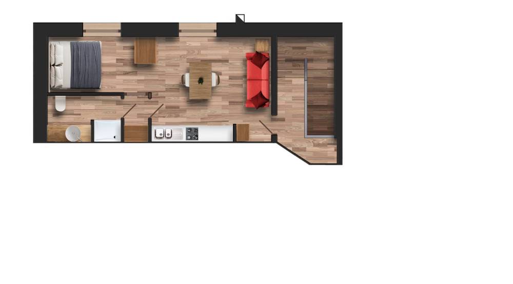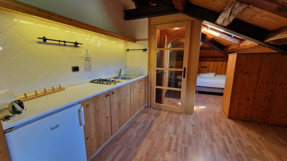 ingresso sulla zona giorno, cucina a vista, zona notte e bagno.