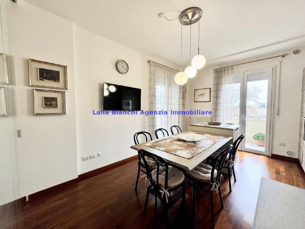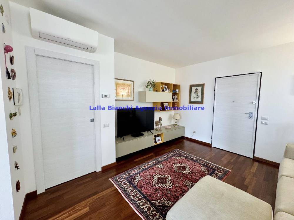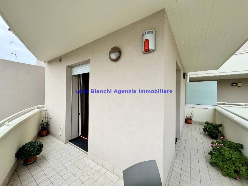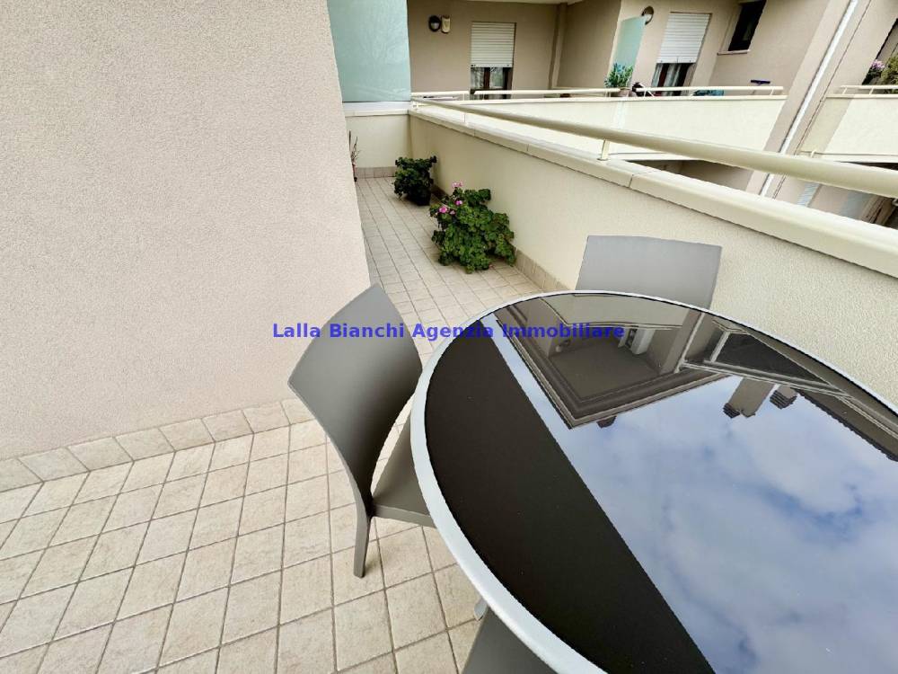 PESARO (PU) / BAIA FLAMINIA: COD. RIF. V. 9199 - L'AGENZIA IMMOBILIARE LALLA BIANCHI propone in VENDITA un elegante Appartamento semi nuovo con due terrazzi al Piano Secondo e un Garage esclusivo al Piano Interrato, all'interno di un recente e signorile piccolo condominio dotato di ascensore. L'abitazione di tipo civile situata al secondo piano di una palazzina residenziale di poche unità, ha una Superficie catastale Totale di 99 m² così suddivisa: - Zona giorno: ingresso diretto su un luminoso soggiorno separato dall'ampia cucina pranzo "abitabile" tramite una raffinata parete a due ante scorrevoli in vetro, da cui si accede ad un ampio terrazzo ideale per pranzi all'aperto. - Zona notte: un disimpegno che accompagna ad un bagno spazioso e finestrato con accesso esclusivo al secondo terrazzo, a due ampie camere da letto e ad una terza stanza attualmente adibita a lavanderia (e comoda dispensa). Completa la proprietà un comodo Garage di Superficie catastale Totale di 22 m² al Piano Interrato, raggiungibile direttamente con l'ascensore a norma disabili (assenza di barriere architettoniche) locato in una zona condominiale ben curata, inclusi ingresso, vano scala e parti comuni. L'appartamento, ultimato e rifinito nel 2019, si presenta in condizioni impeccabili, perfettamente mantenuto e pronto per essere abitato senza necessità di lavori, le finiture interne sono di alto livello, con pavimenti in parquet nella zona giorno e nelle camere, la residenza è dotata di video-citofon