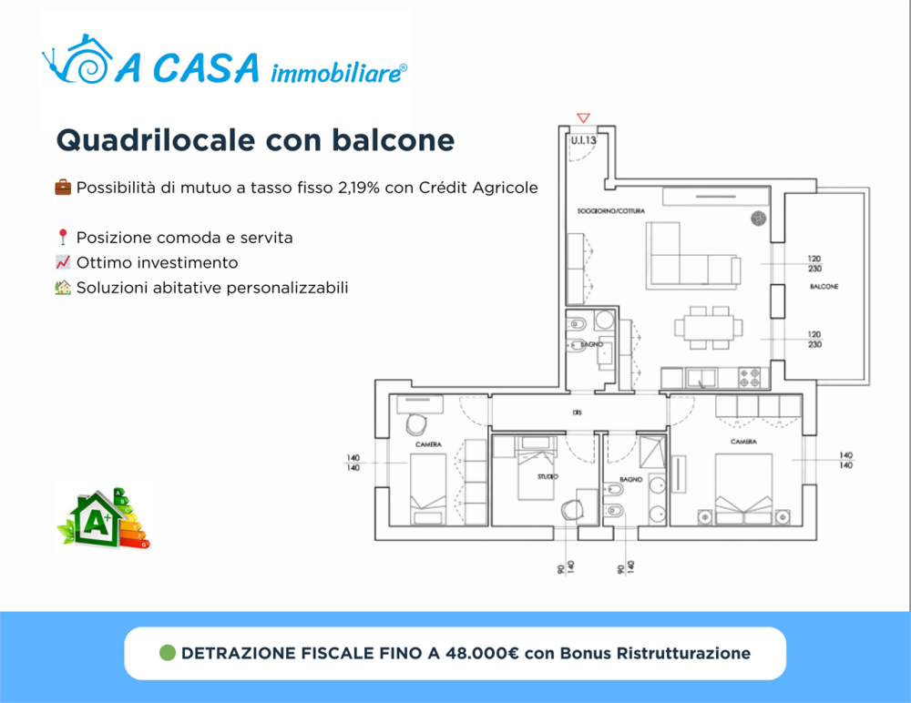Al piano primo proponiamo in vendita un elegante quadrilocale composto da zona cucina-soggiorno, due camere e uno studio/camera, due bagni e balcone di mq 13, per un totale di mq 115