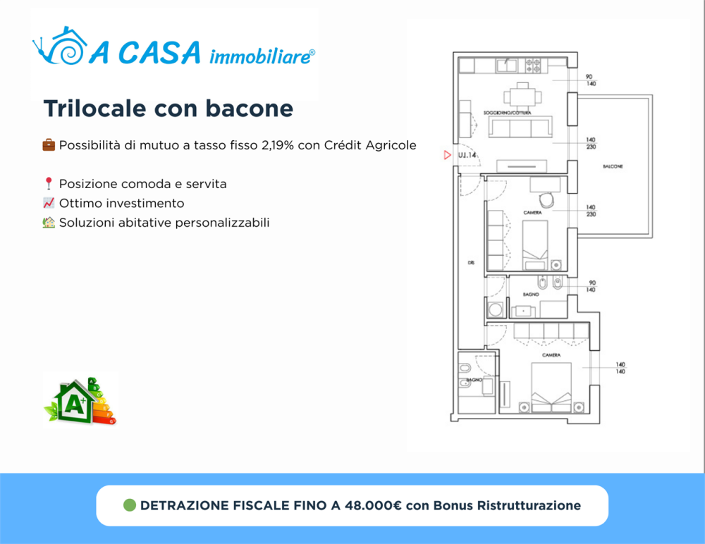 Al piano primo proponiamo in vendita trilocale , composto da zona giorno-cucina, 2 camere, 2 bagni e balcone di mq 17, per un totale di mq 101mq.