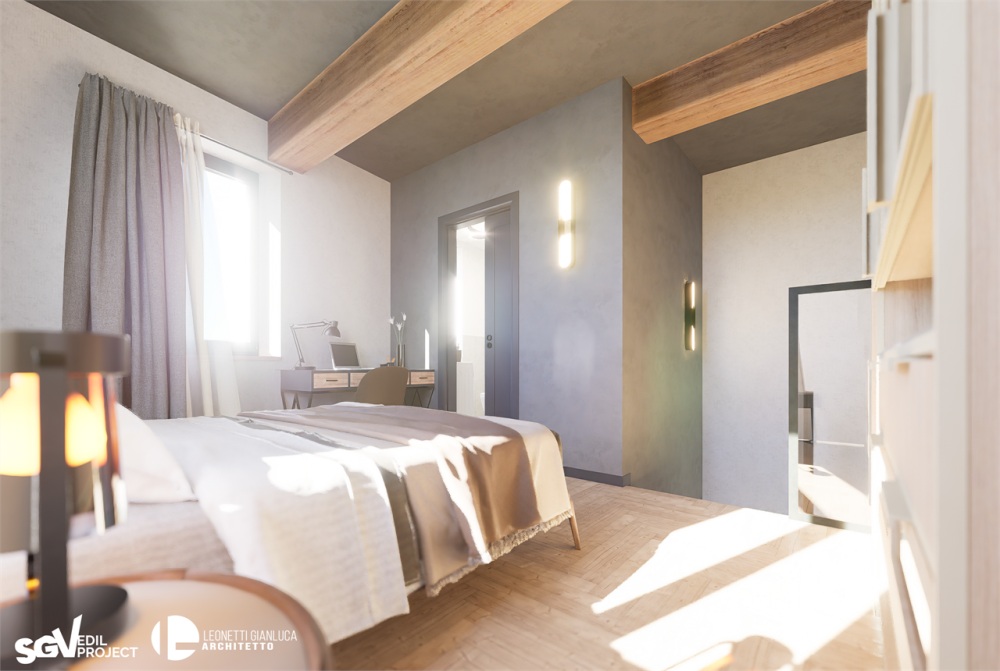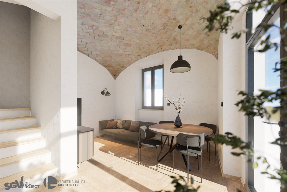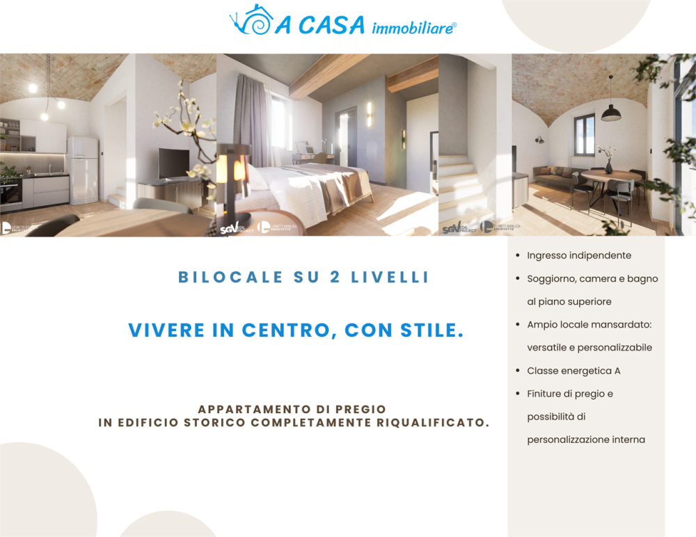 Dalla totale ristrutturazione di un'antica casa cittadina nasce questo appartamento con ingresso indipendente in soggiorno, camera e bagno al piano superiore e ampio locale accessorio che si presta a personalizzazione al piano mansardato.