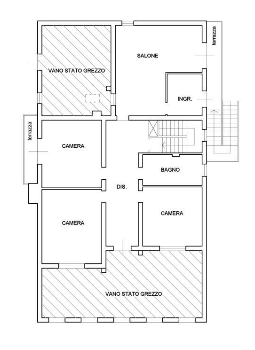 Alloggio al piano primo: ingresso, ampio salone lato nord-est (nell'ultimo stato progettuale suddivisibile in due camere singole, ripostiglio e disimpegno), disimpegno, tre camere e bagno.