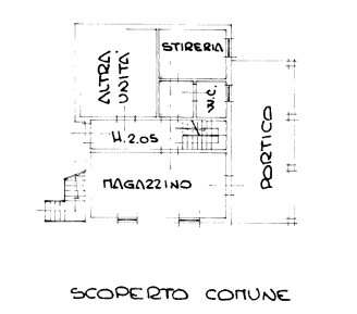 Al piano terra sul fronte ovest è presente un porticato. L'area scoperta è adibita a camminamento e giardino.
