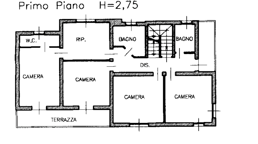 Al piano primo ci sono quattro camere, tre bagni, vano ripostiglio utilizzato come studio. Al piano secondo c'è una soffitta utilizzata come ripostiglio.