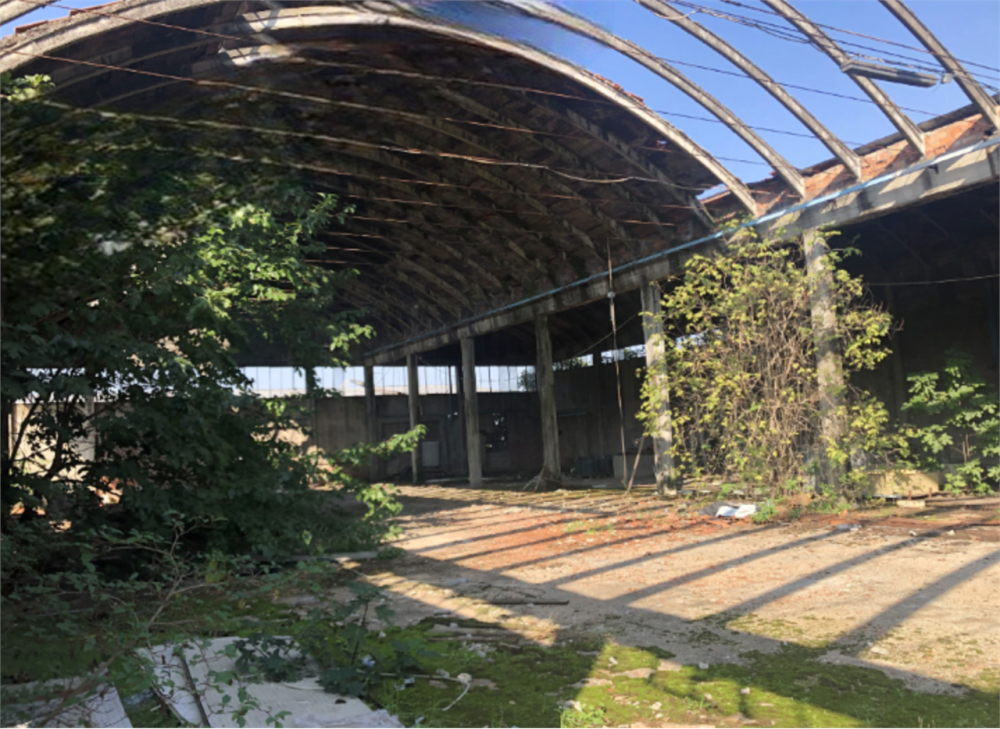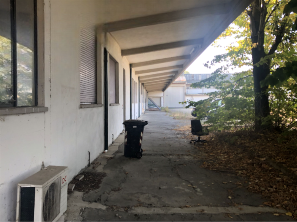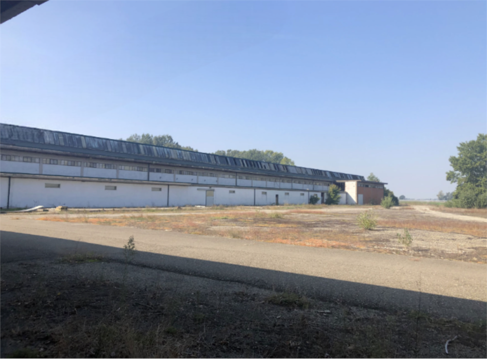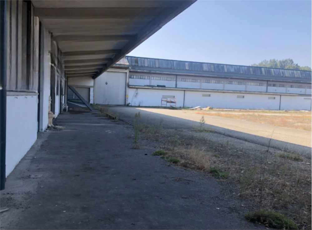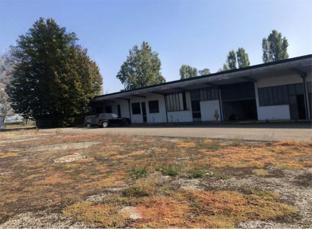 b) edificio di mq. 811 da terra a tetto, elevato di un piano fuori terra, composto di officina, magazzini, laboratori, spogliatoio, servizi, sala ristoro, appartamento del custode, uffici e bagno, con pensilina adiacente di mq. 287 ,il tutto con annessa area cortilizia di 30.115mq circostante di pertinenza e adiacenti appezzamenti di terreno in lato nord ed ovest di mq. 29.173 e 7.956mq.