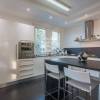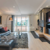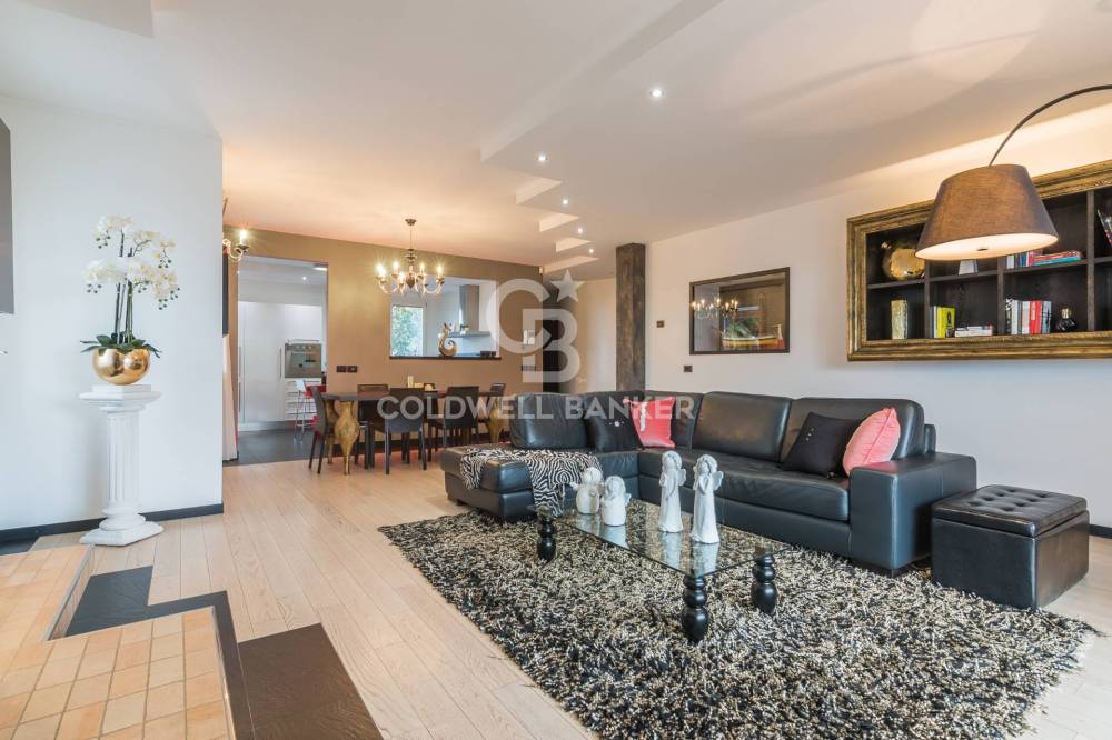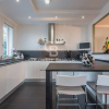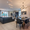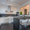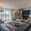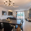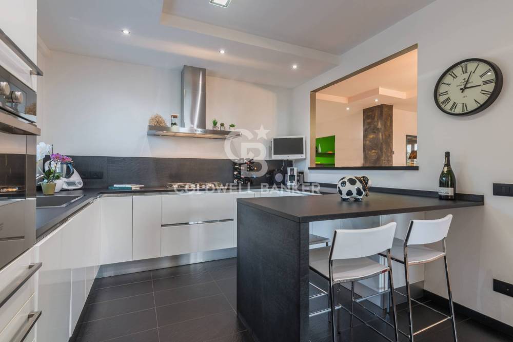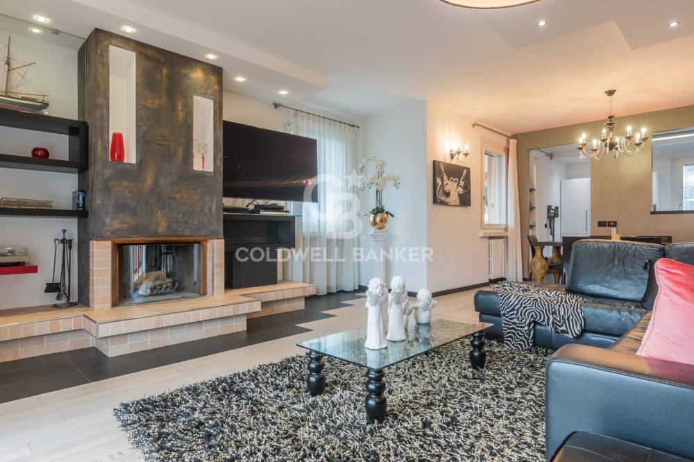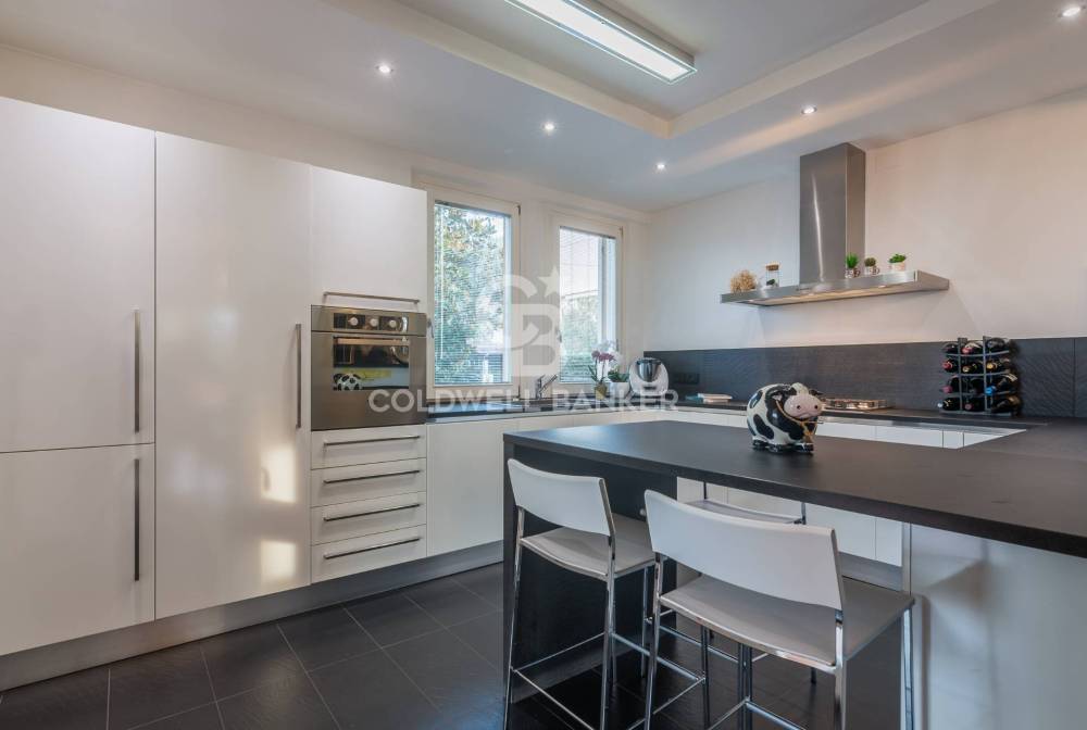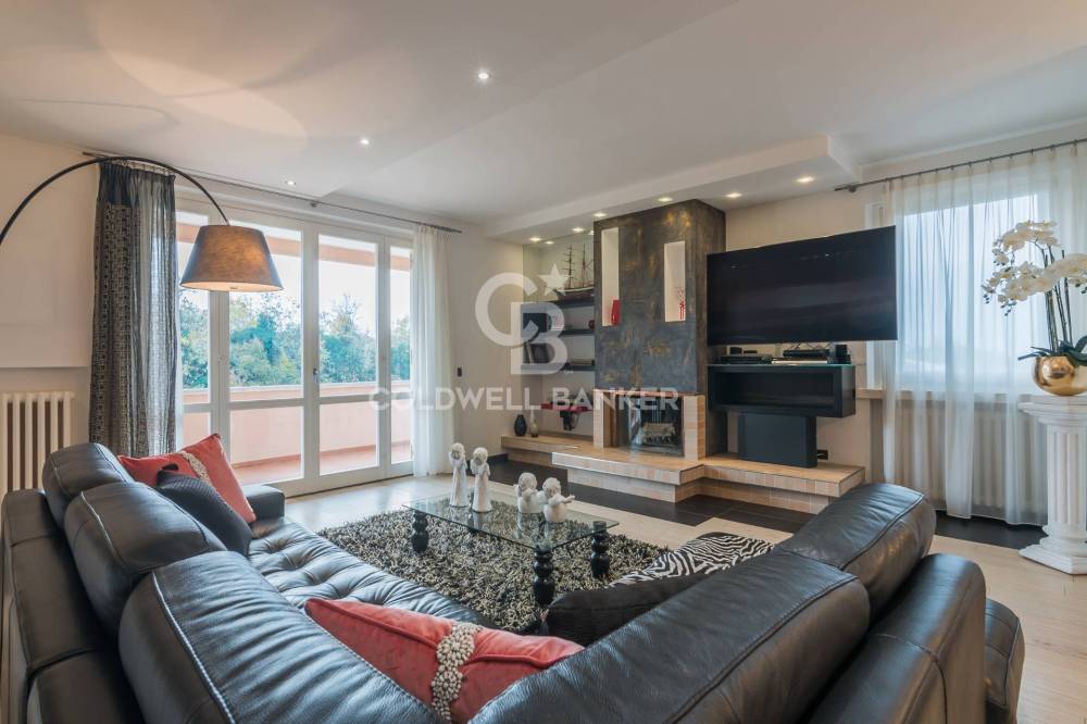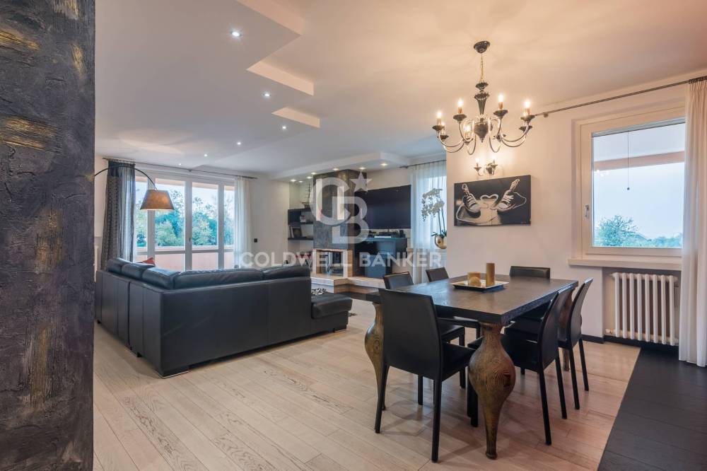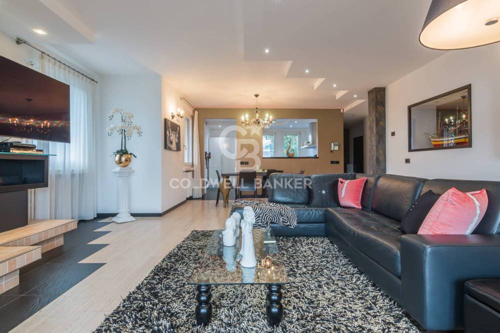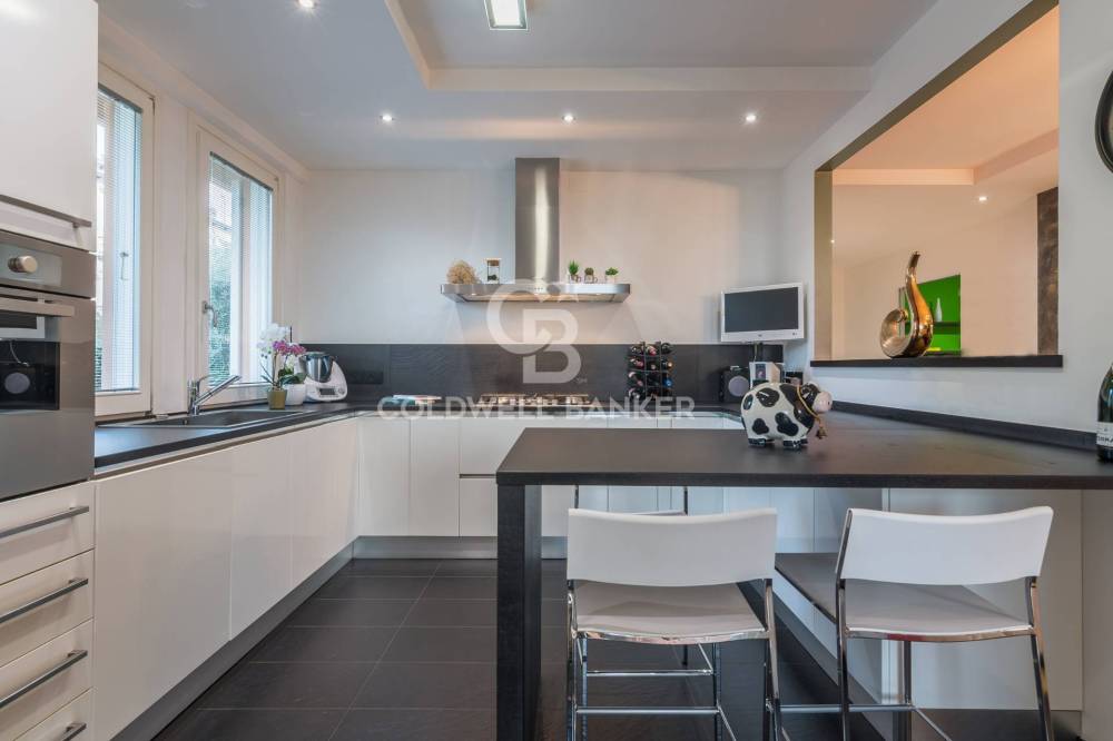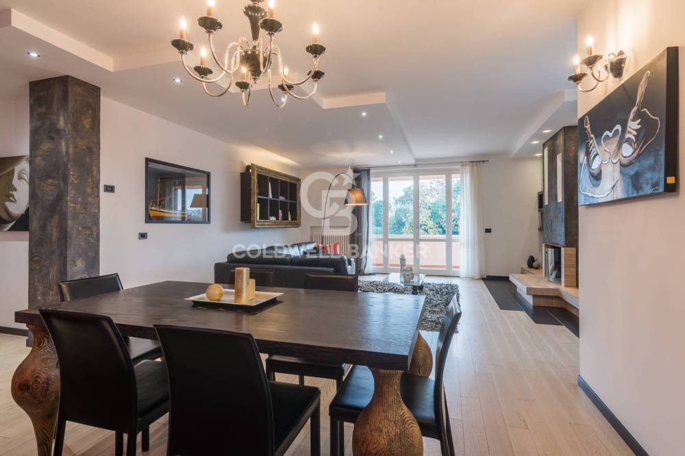 Allinterno si apre un luminoso living di grande impatto scenografico, caratterizzato da una parete attrezzata con camino e da ambienti armoniosi e ben organizzati. Adiacente al soggiorno, lelegante zona pranzo si affaccia su una cucina di design completamente attrezzata, dotata di penisola breakfast ideale per momenti conviviali e praticità quotidiana. Completa la zona giorno un raffinato studio in stile minimal.