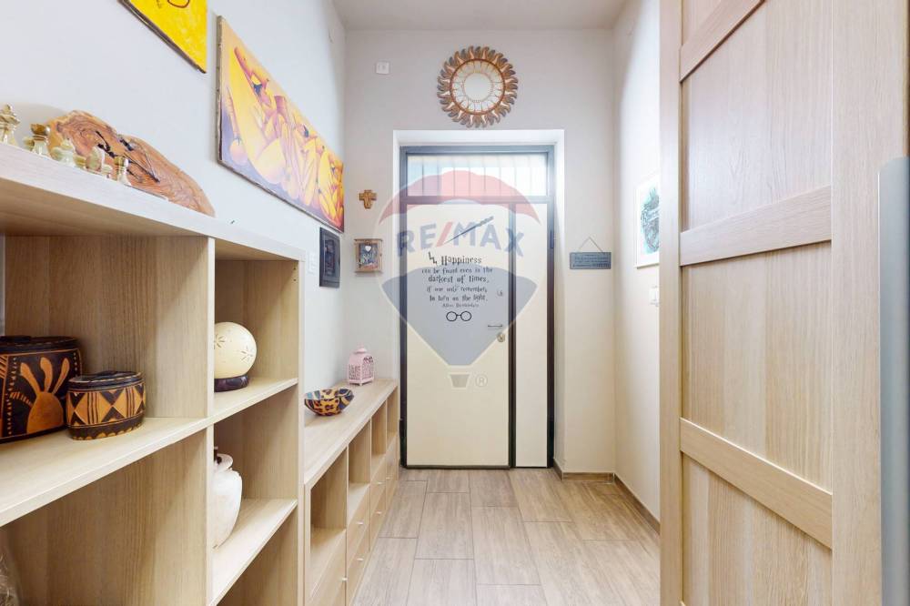 L'ingresso, indipendente, apre su un lungo e spazioso disimpegno, che separa la zona giorno (lato est) dalla zona notte (lato ovest).