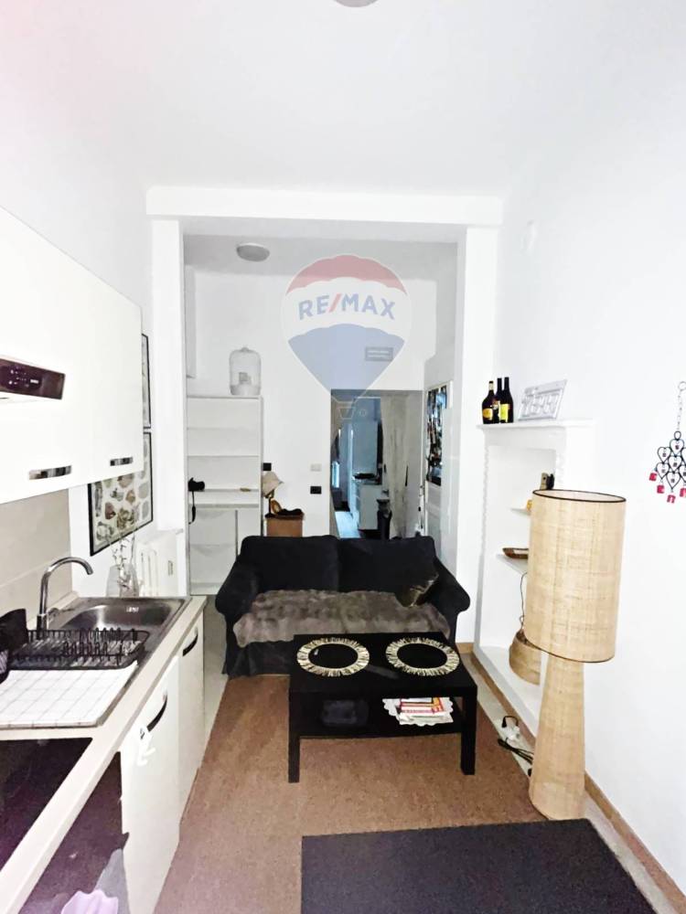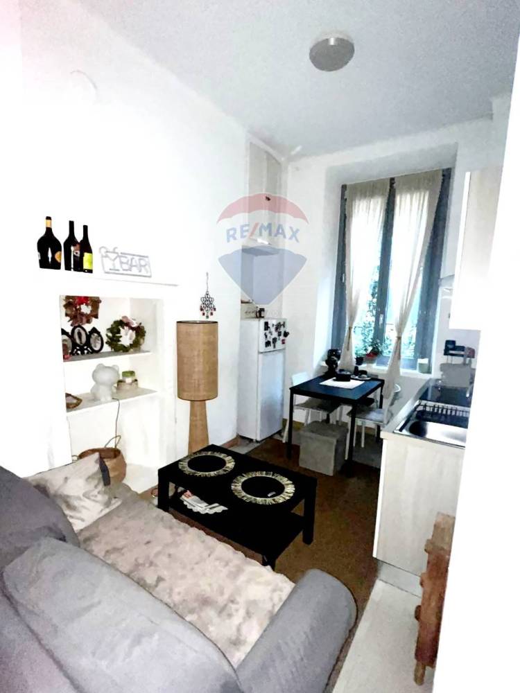 Soggiorno con cucina a vista, compatto ma pratico, ideale come zona living/pranzo.