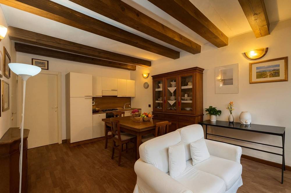 Le ottime rifiniture valorizzano limmobile: travi a vista e pavimentazione in parquet che donano carattere e calore agli ambienti.