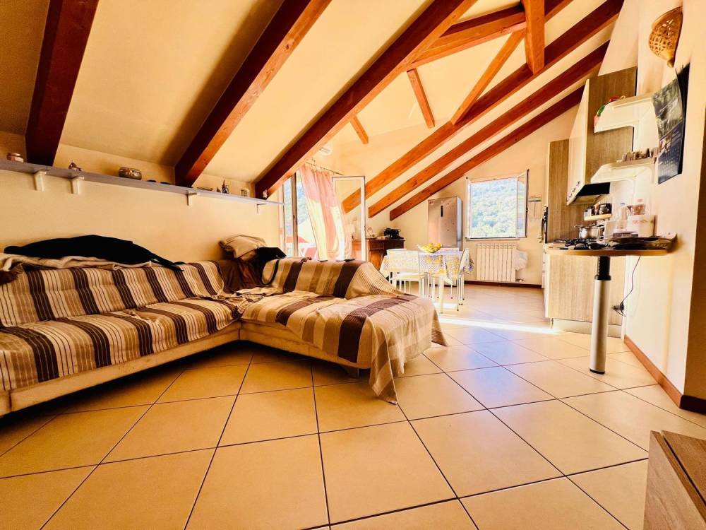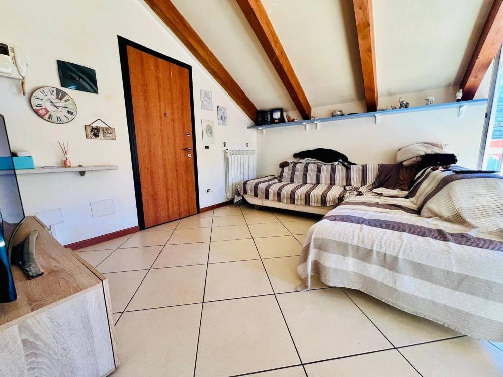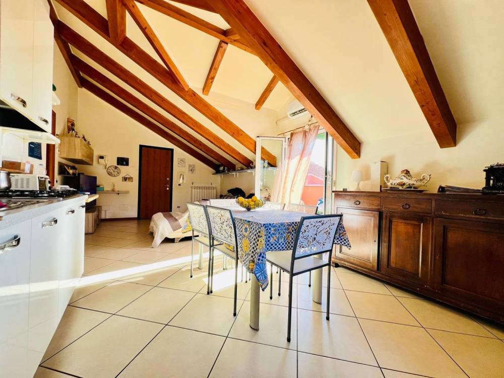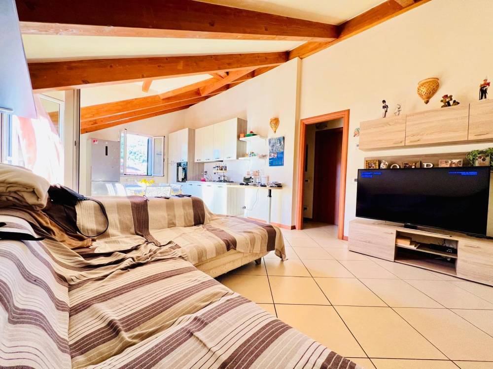 Internamente è composto da ingresso su zona giorno open-space con cucina a vista avente sfogo su terrazzo privato con tendaggi da sole da poco installati; un disimpegno porta alla zona notte composta da due camere da letto matrimoniali con velux doppi vetri e bagno finestrato con box doccia.