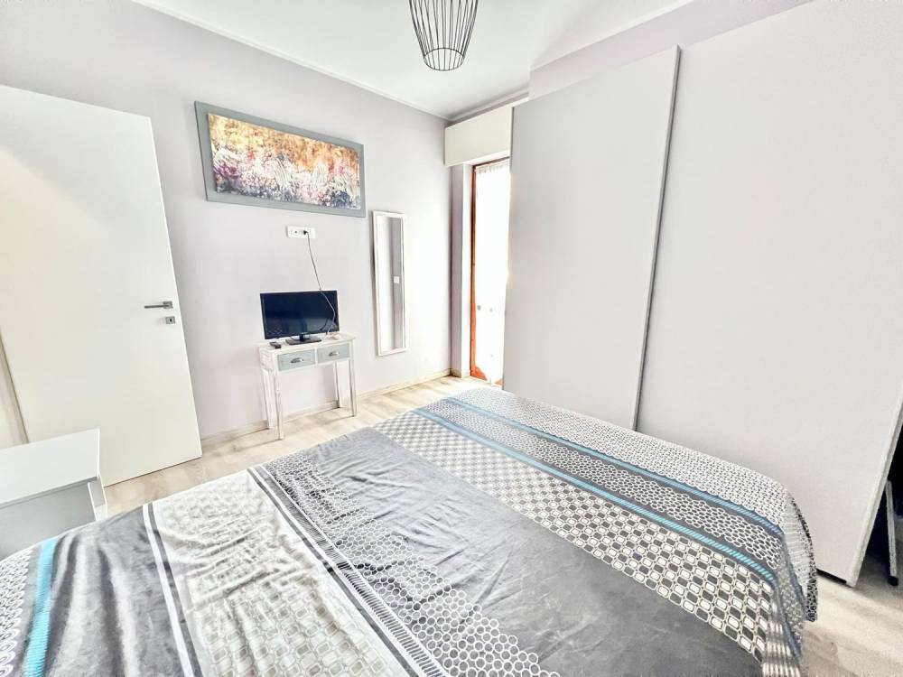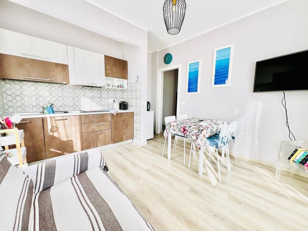L'ingresso si apre su un disimpegno che conduce a una luminosa camera da letto matrimoniale dotata di un delizioso balcone alla francese. Il soggiorno, con cucina a vista, offre accesso a un ampio balcone con vista mare, perfetto per godersi il sole e i tramonti. Il bagno finestrato è completo di box doccia e garantisce praticità e comfort.