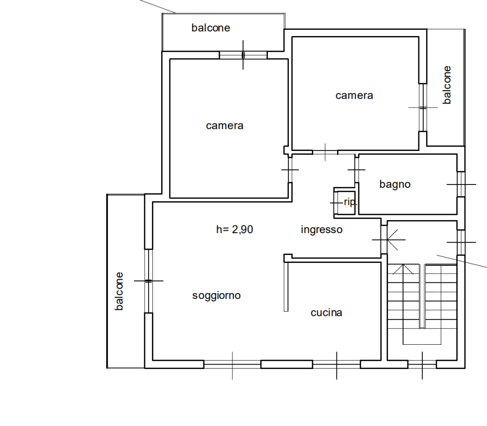Trattasi di appartamento posto al piano primo con disimpegno d'ingresso, due camere da letto, disimpegno zona notte, cucina, soggiorno, bagno e tre balconi di totale 7,83mq.