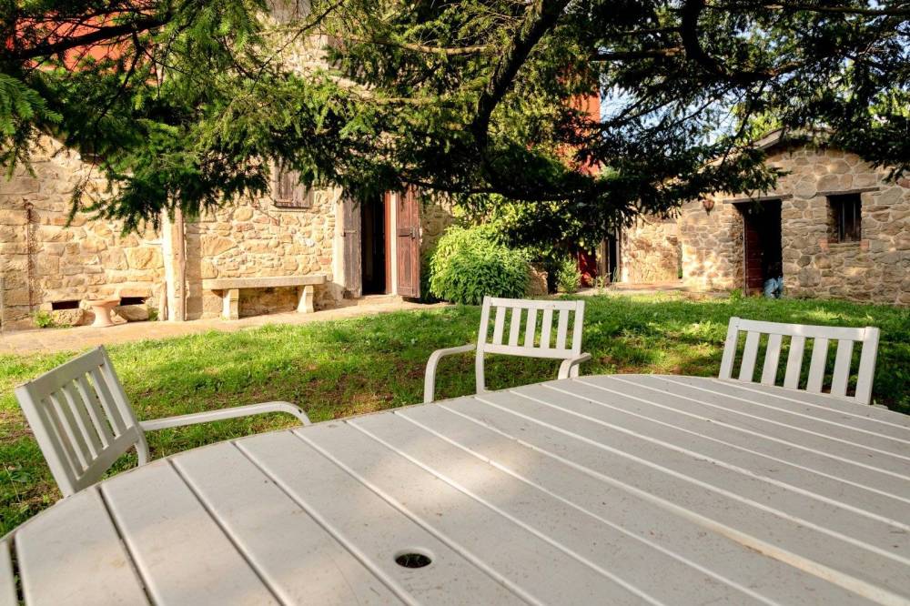 All'esterno, poco discosto dal fabbricato principale, troviamo un ampio garage utilizzabile anche come rimessa per attrezzi agricoli, una suggestiva dependance in pietra e una terrazza panoramica che offre una vista impareggiabile. La proprietà si estende su oltre 18.000 mq di terreno, con ulivi in produzione e una piccola vigna.
