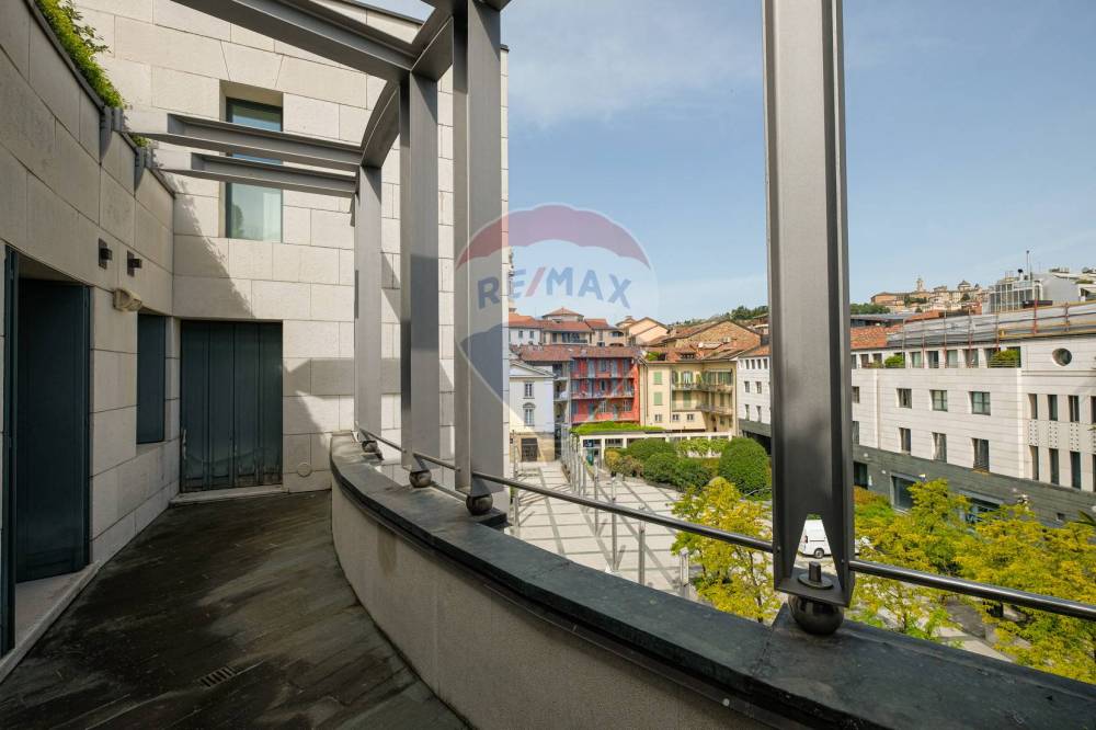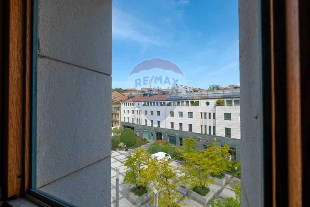 Il grande soggiorno accoglie con la sua luminosità, affacciandosi su un balcone che regala una vista incantevole sulla vivace piazzetta pedonale e sul panorama urbano, con lo sguardo che si perde fino alla maestosa Città Alta. Qui, il bagno di servizio, rivestito in elegante onice, aggiunge un tocco di raffinatezza.