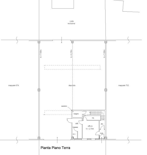 Capannone artigianale composto al piano terra da ingresso comune, deposito costituito da ampio vano a doppio volume, antibagno e due bagni, ufficio, ripostiglio.