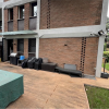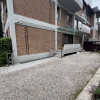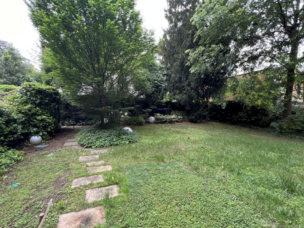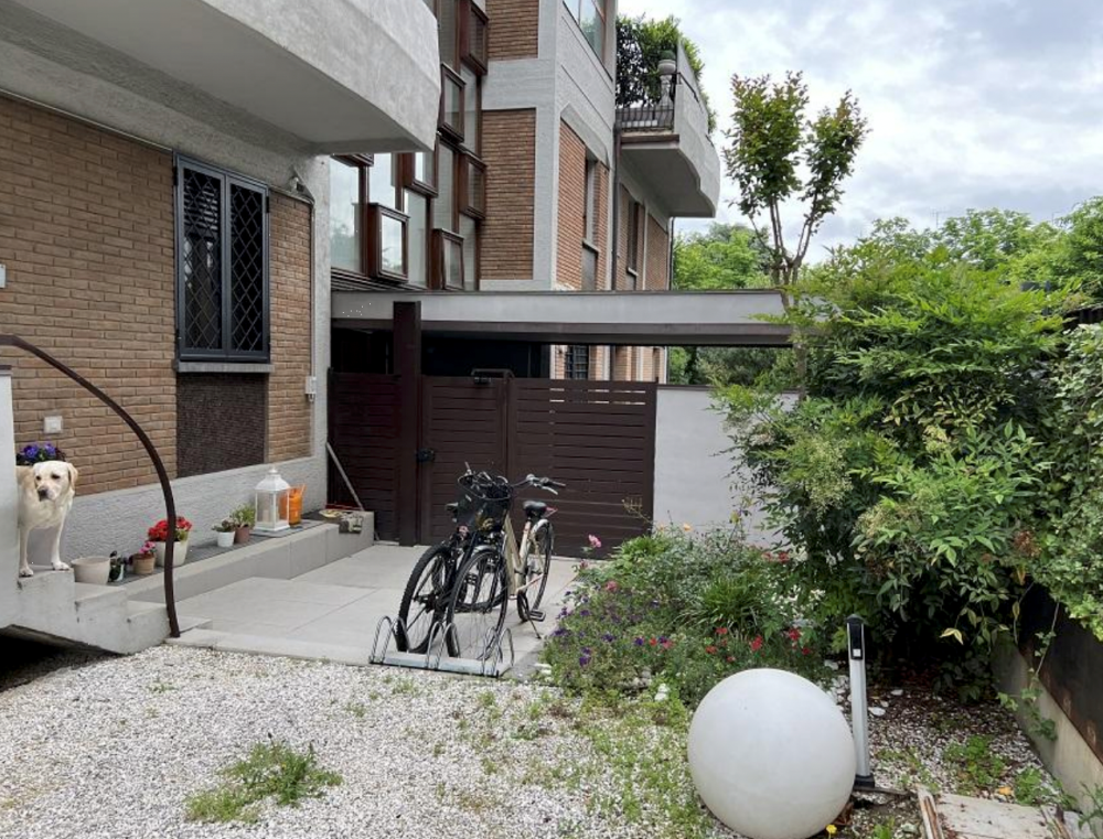 Accanto alla cucina si trova un piccolo disimpegno con l'unica porta-finestra che conduce alla seconda porzione di corte/giardino, dove è presente anche una scala in ferro che collega al piano interrato con lavanderia.