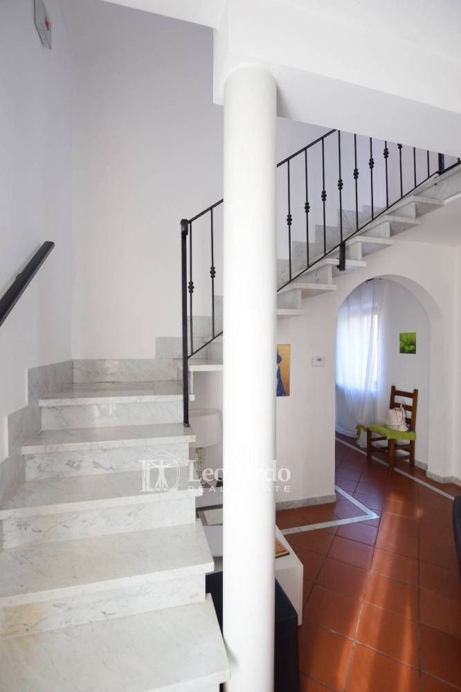 La scala in marmo porta dal salotto al piano superiore dove si trovano due camere matrimoniali, una cameretta, il secondo bagno e due balconi.