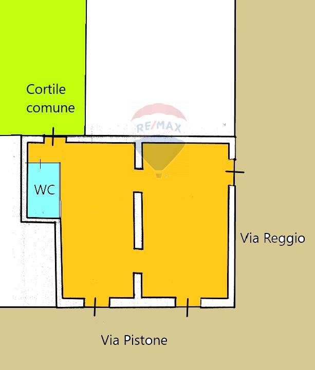 Posizionato ad angolo fra via Pistone e via Reggio, l'immobile dispone di 3 aperture sulle 2 suddette strade ed una quarta all'interno, su un cortile in comune con le abitazioni adiacenti.