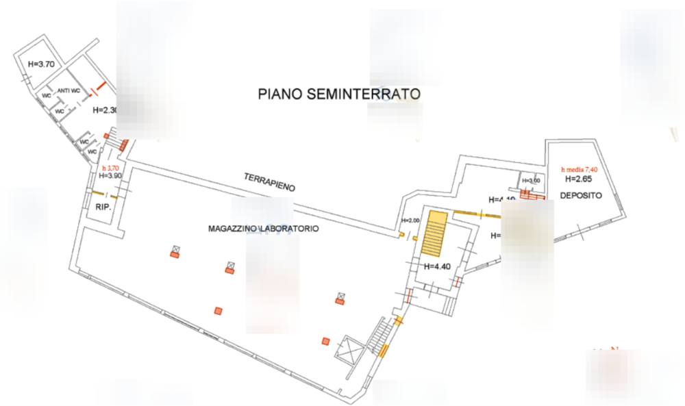 -piano seminterrato adibito a laboratorio e magazzino con locali accessori di superficie complessiva mq 798,54; il piano terra è adibito a uso magazzino e locali ufficio di superficie complessiva di mq 505,52 di cui superficie produttiva mq 378,89 e superficie ufficio mq126,63.