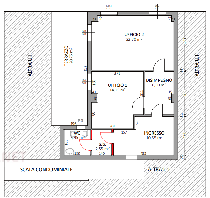 Ufficio situato a Pesaro (PU), in Viale dei Partigiani, posto al primo piano. L'unità è composta da un ingresso con funzione distributiva, un vano disimpegno e due locali ufficio finestrati, entrambi con accesso a una terrazza scoperta. Completano la proprietà un antibagno e un servizio igienico finestrato e un posto auto di 12 mq.