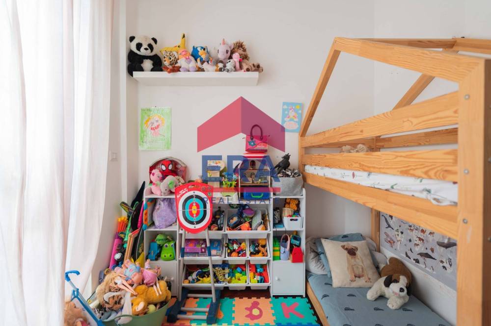 Lappartamento si apre su un luminoso soggiorno con doppia esposizione con cucina a vista. La zona notte è composta da una camera matrimoniale con bagno "en suite" con vasca, una cameretta con accesso diretto al balcone e un secondo bagno con doccia.