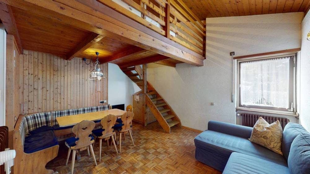 Una minickucina compatta e organizzata rende semplice ogni momento conviviale, mentre il soggiorno, dominato dal legno e della luce , invita a tisane fumanti dopo una camminata o a risate soffuse nelle sere d'inverno.