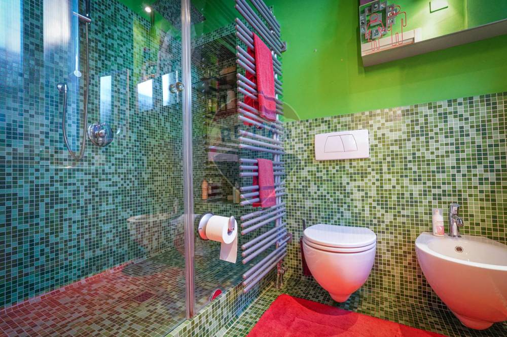Dall'elegante porta scorrevole si accede alla sala da bagno con la vasca idromassaggio centrale, lavabi doppi e nicchie con incisioni storiche.