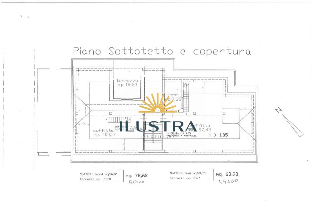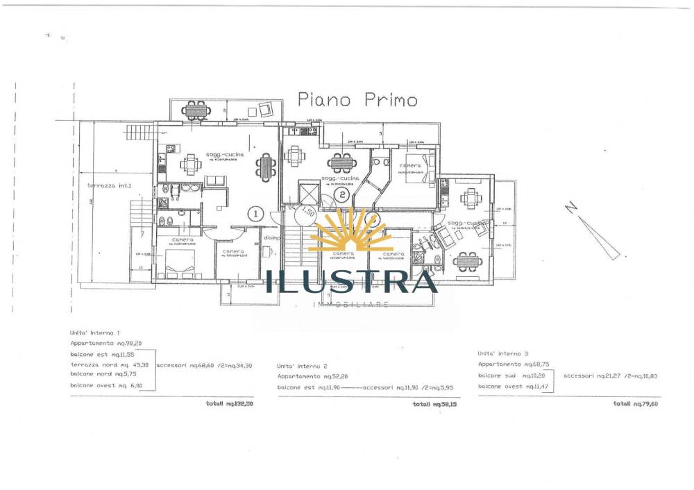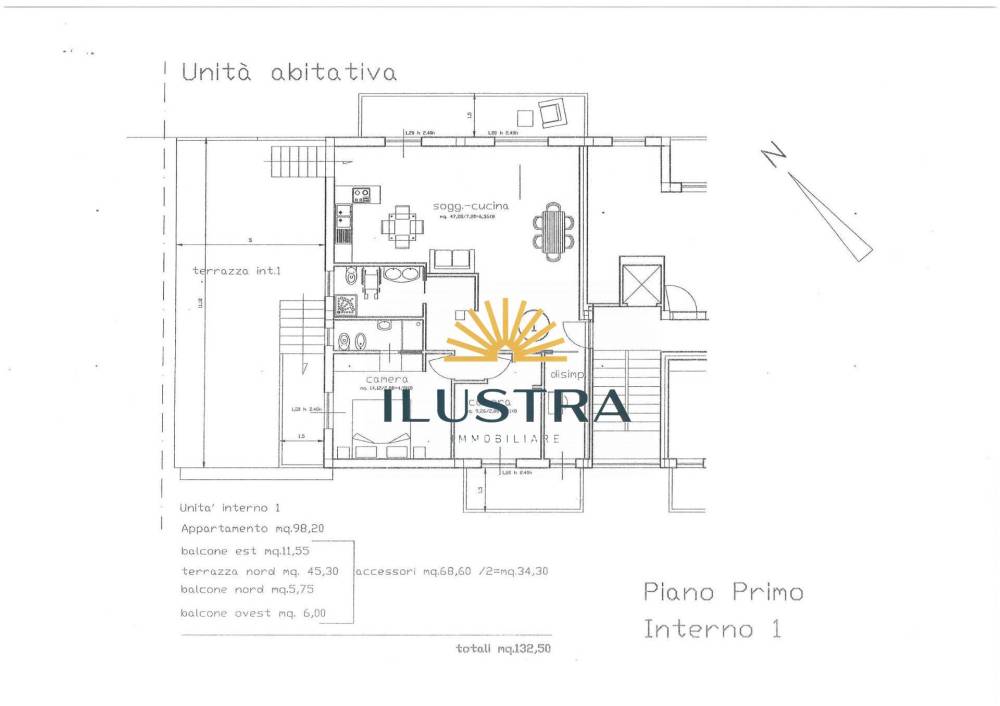 - Appartamento trilocale 132 mq commerciali, 98 mq calpestabili, balcone est 11.5 mq, balcone nord 5,75 mq, balcone ovest 6 mq, terrazza nord 45mq