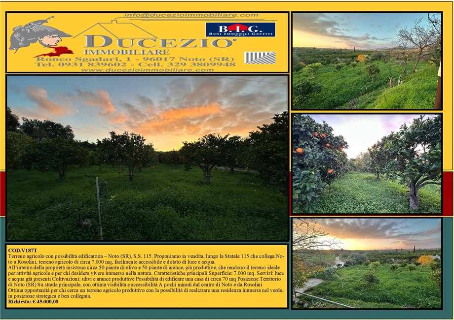 Terreno agricolo con possibilità edificatoria a Noto s. s. 115, Proponiamo in vendita lungo la statale 115 che collega Noto a Rosolini, terreno agricolo di circa 7000 mq, facilmente accessibile e dotato di luce e acqua. All'interno della proprietà insistono circa 50 piante di ulivo e 50 piante di arance, già produttive, che rendono il terreno ideale per attività agricole e per chi desidera vivere immerso nella natura. Caratteristiche principali superfice: 7000 mq servizi: luce e acqua già presenti, coltivazioni: ulivi e arance produttive, possibilità di edificare una casa di circa 70 mq