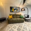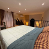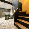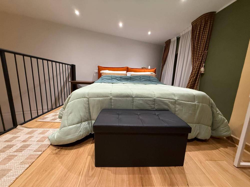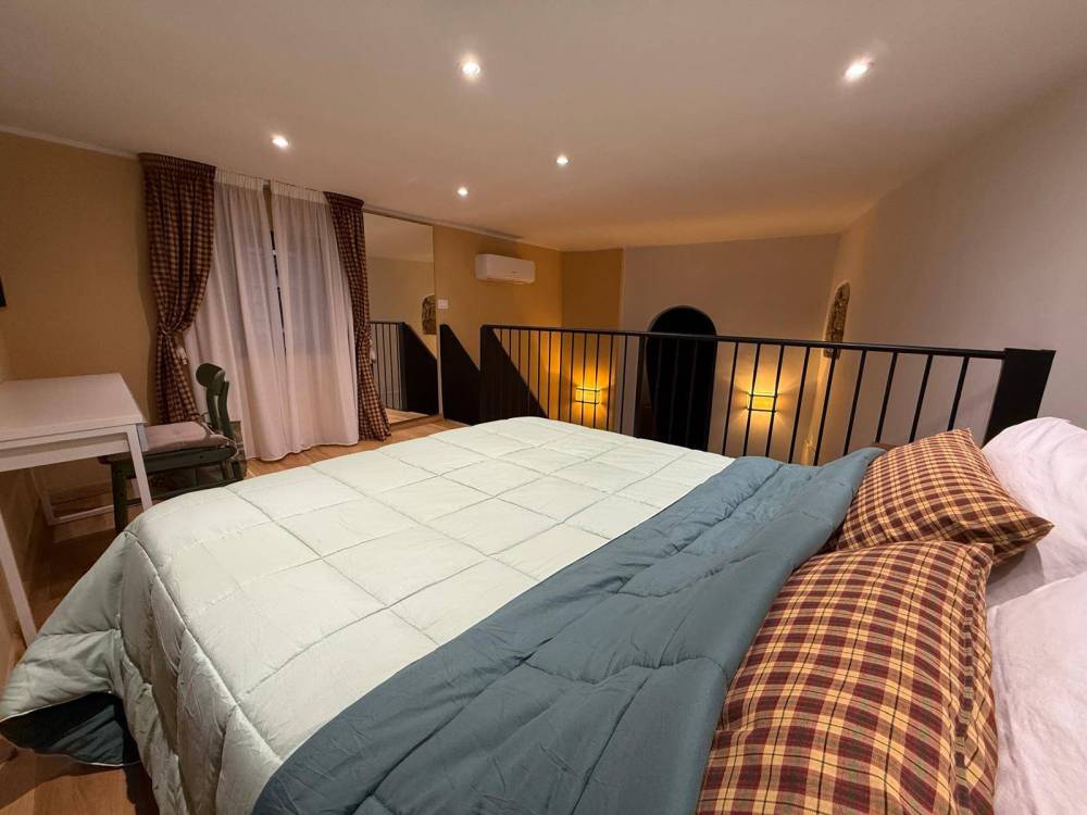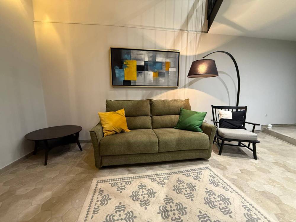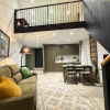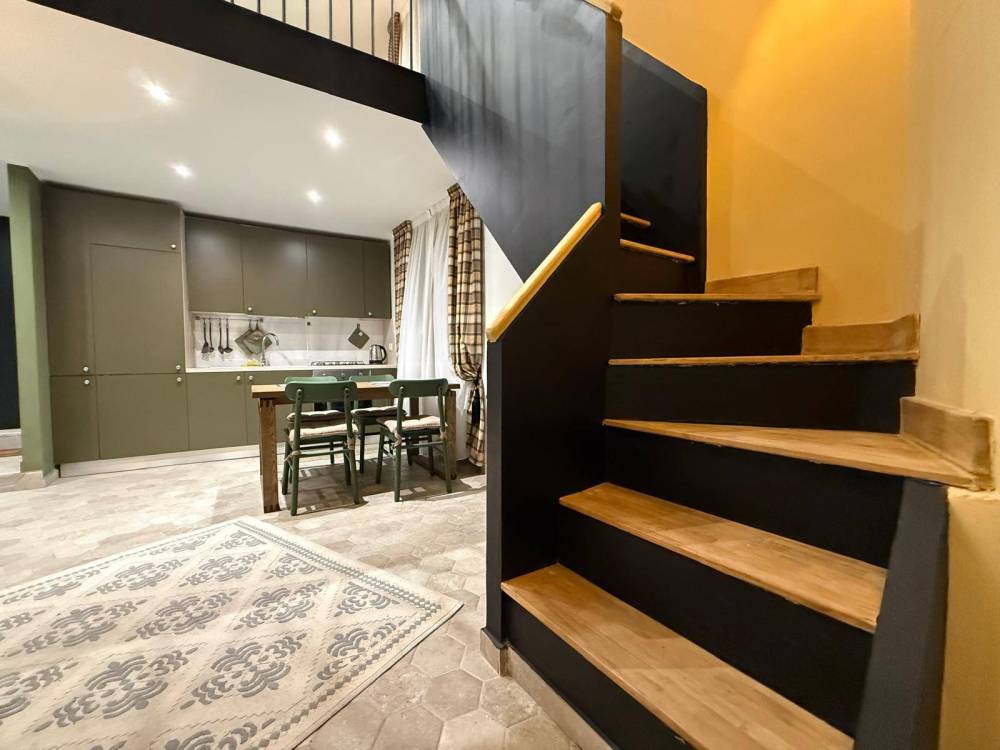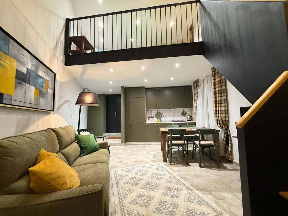 La zona giorno è ulteriormente valorizzata da un raffinato soppalco che ospita una seconda camera da letto, creando un ambiente intimo e suggestivo.