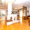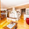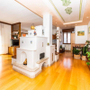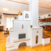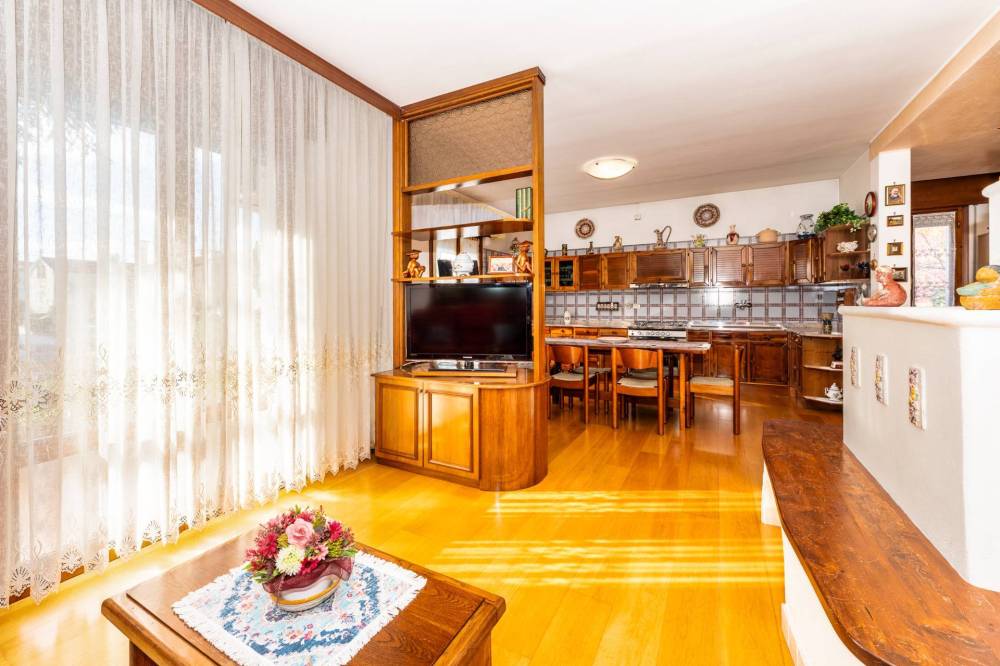 un grande ingresso introduce a un soggiorno luminoso, impreziosito da una caratteristica stufa centrale in muratura che suddivide gli spazi con eleganza.