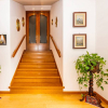 Unelegante scala in legno chiaro conduce al reparto notte, che si apre su un generoso disimpegno e ospita ben quattro camere da letto: