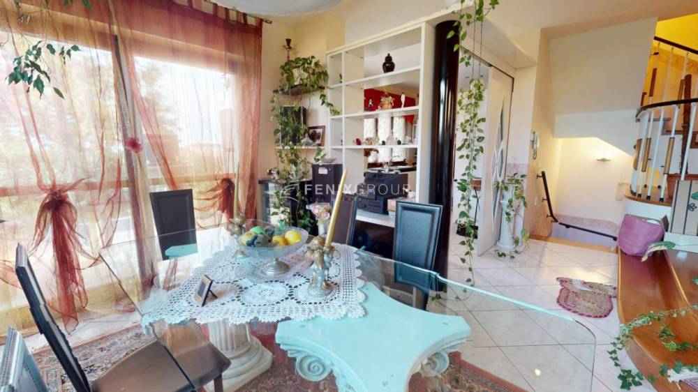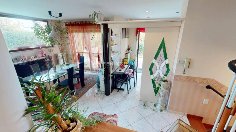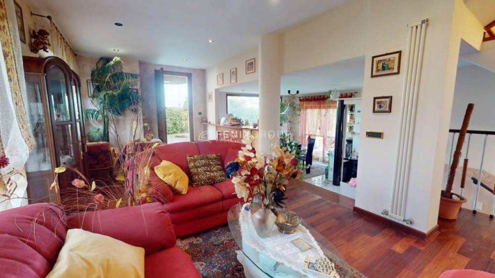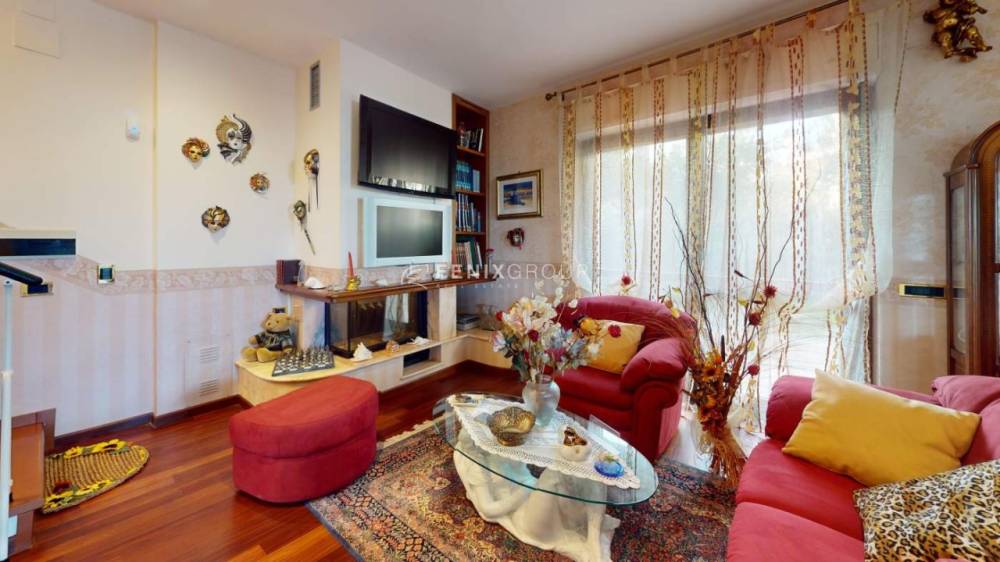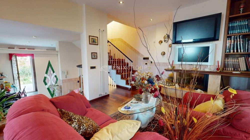 L’ingresso al piano terra introduce a un soggiorno ampio, luminoso e raffinato, caratterizzato da un elegante camino che dona calore e atmosfera all’ambiente.