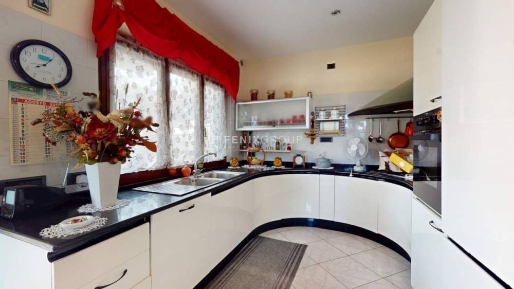 La cucina, separata e funzionale, permette l’accesso diretto all’area esterna pavimentata attrezzata con barbecue, luogo perfetto per cene all’aperto e piacevoli occasioni di relax.