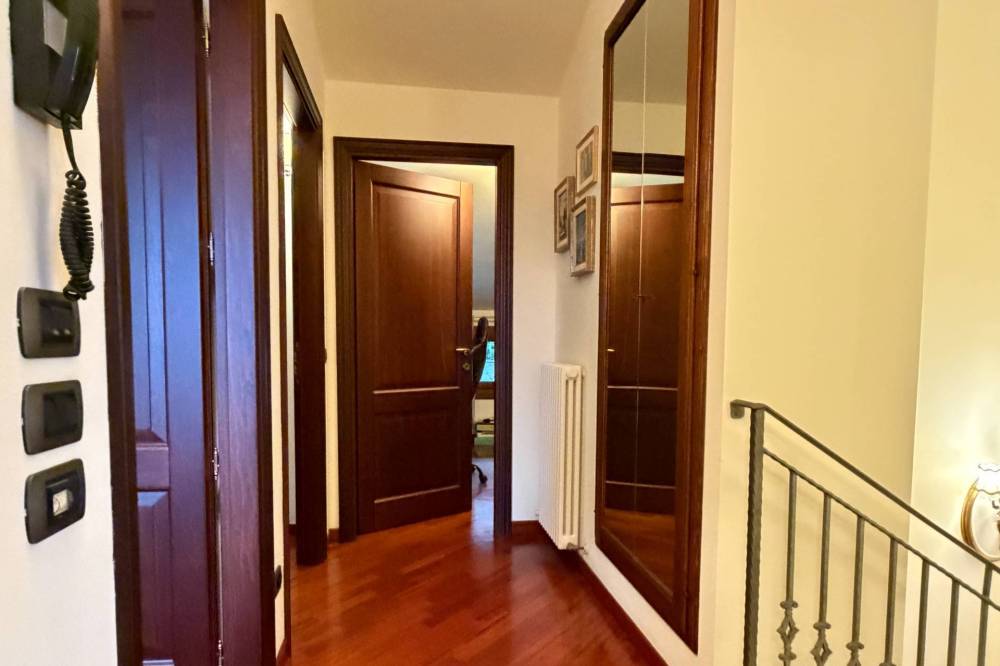 Il piano primo, raggiungibile sia tramite una comoda scala interna che da una scala esterna, è suddiviso in: ingresso su ampio salone con camino, cucina che si affaccia sul portico comodo e spazioso nel retro della villa e circondato da giardino dotato di irrigazione, un disimpegno, ripostiglio, bagno ed una scala che dal soggiorno conduce al livello superiore in cui troviamo una camera grande un bagno un disimpegno ed altre due vani adibiti a mansarda ma che godono di una dimensione ed altezza tali da poter essere usati come comode camere.