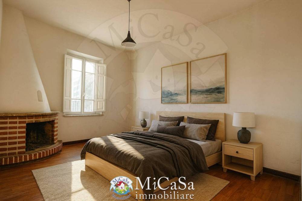 Labitazione si compone di: ingresso, cucina, salotto con camino, due ampie camere matrimoniali e bagno finestrato con box doccia.
