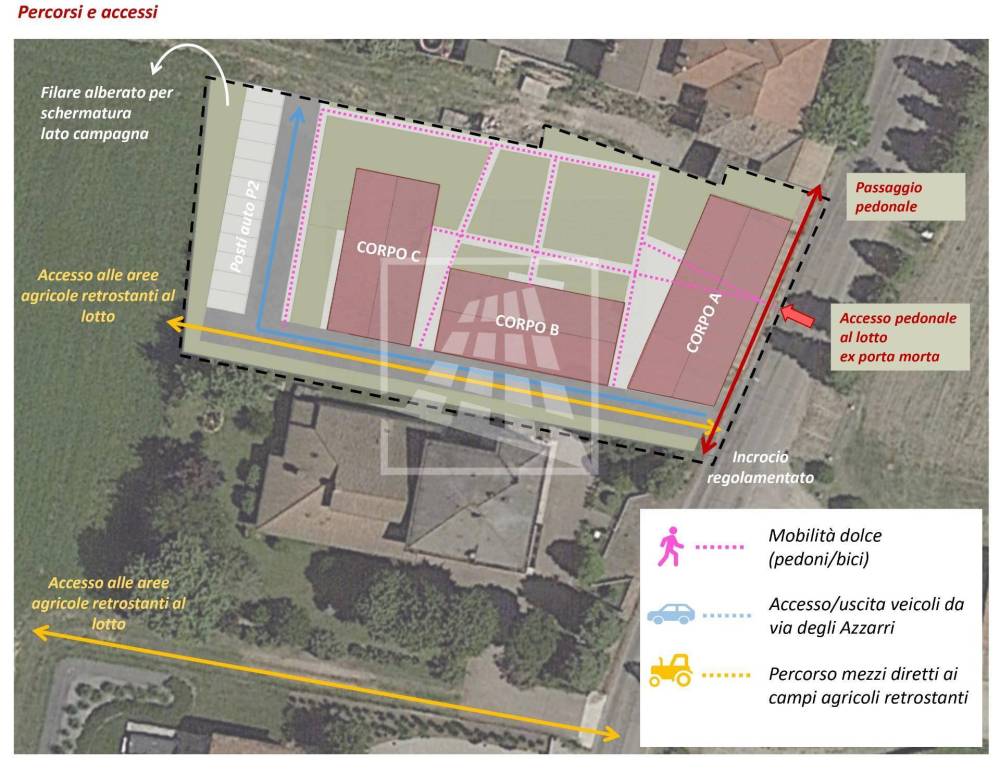 Il Borgo degli Azzarri sarà composto da 3 distinti fabbricati sviluppati secondo un'impostazione architettonica che rispecchierà i principi della tradizione costruttiva rurale reggiana riprendendone gli elementi distintivi come proporzioni armoniose e volumi ben equilibrati, materiali tradizionali reinterpretati in chiave moderna, coperture a due falde e finiture esterne coerenti con il paesaggio circostante al fine di garantire una continuità estetica con il contesto territoriale agricolo.