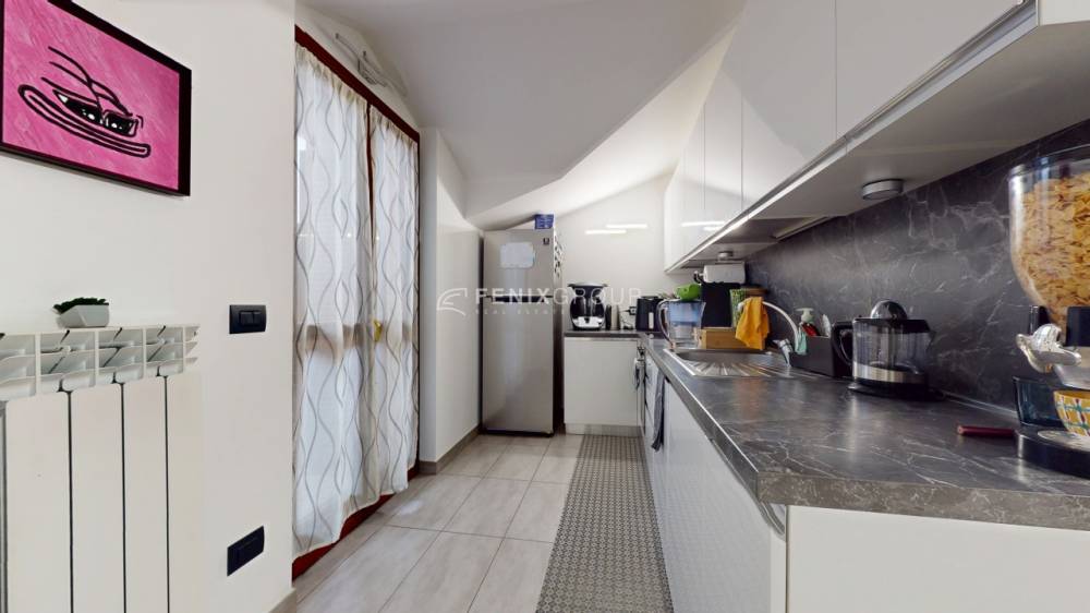 L’ingresso si apre direttamente su un soggiorno ampio e confortevole, uno spazio pensato per la vita quotidiana e per i momenti di relax, reso ancora più piacevole dalla presenza della portafinestra che consente l’accesso diretto al terrazzo di 70 mq circa. Quest’ultimo rappresenta un valore aggiunto dell’abitazione, perfetto per trascorrere momenti all’aperto, pranzare durante la bella stagione o semplicemente godersi un angolo di tranquillità. Alla sinistra dell’ingresso si sviluppa la cucina, disposta in lunghezza, funzionale e ben organizzata, con spazio sufficiente per una composizione completa e per muoversi agevolmente durante la preparazione dei pasti.