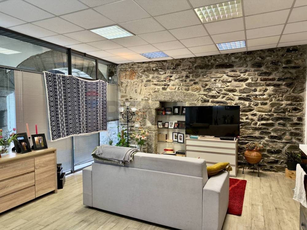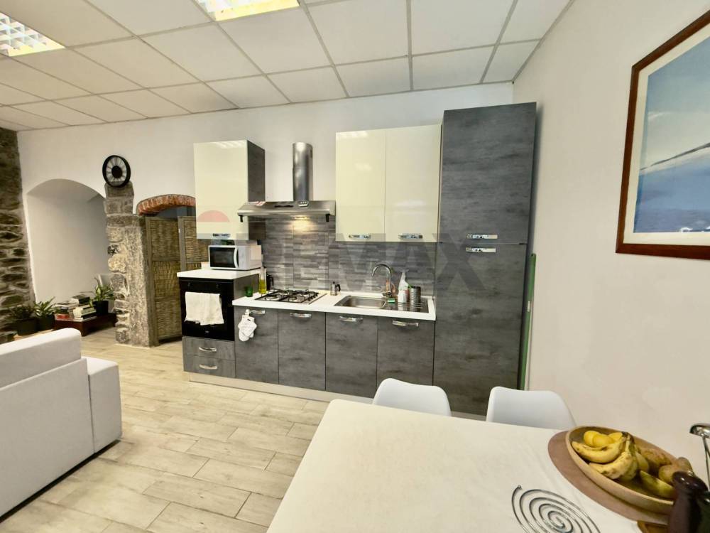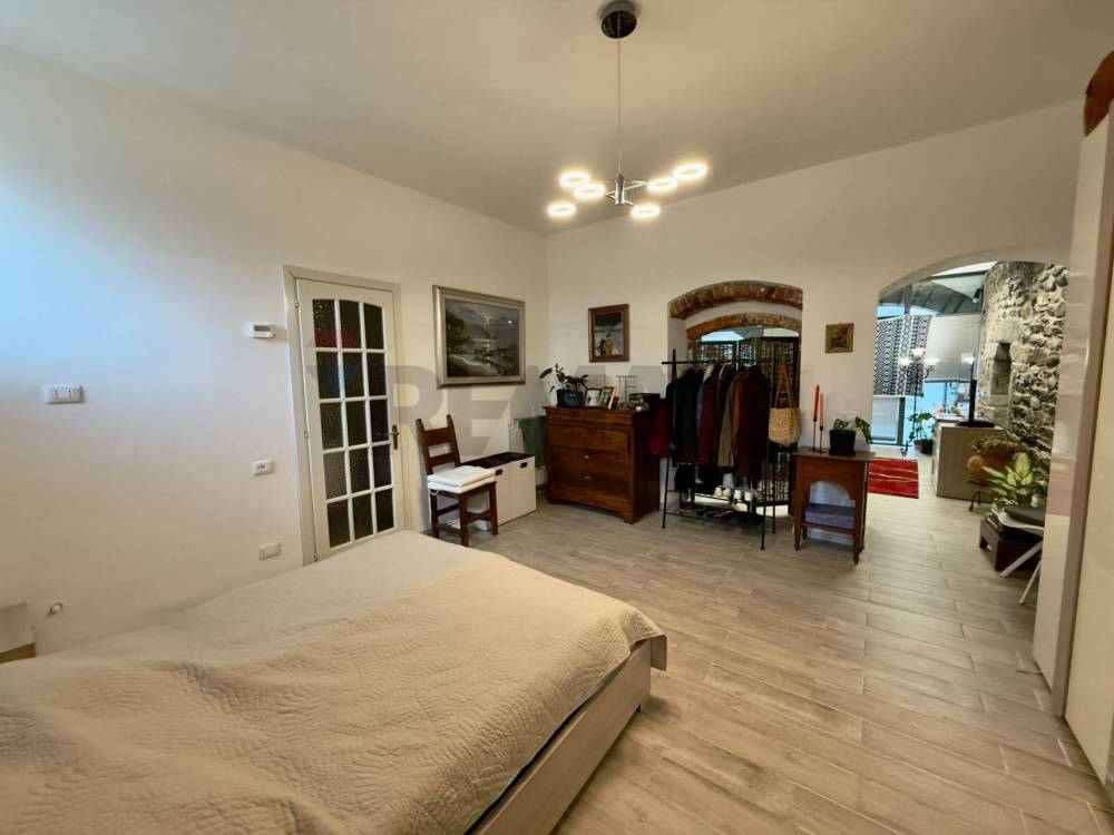 E composto da un unico ampio locale composto da zona giorno con angolo cottura/pranzo, dal soggiorno/TV e da unampia zona notte oltre che al bagno con doccia. Le due zone sono delimitate da un antico e originale pilastro che sorregge due arcate e che divide in modo funzionale lo spazio. Decisamente di effetto la parete con i sassi a vista con una nicchia incorniciata da pilastri e un architrave in sasso (sicuramente un antico passaggio) testimonianza della storicità dello stabile, così come limponente facciata in sasso caratterizzata da una maestosa colonna che sorregge due archi a tutto sesto ribassato. Questi antichi elementi, con gli infissi moderni a tutta parete creano un contrasto armonioso tra antico e contemporaneo. Le ampie vetrate assicurano poi ottima luminosità e continuità tra spazi interni ed esterni.