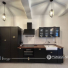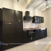 La cucina a vista, dal design moderno, è realizzata su misura con piano effetto legno, schienale in marmo ed elettrodomestici integrati, coniugando estetica e funzionalità.