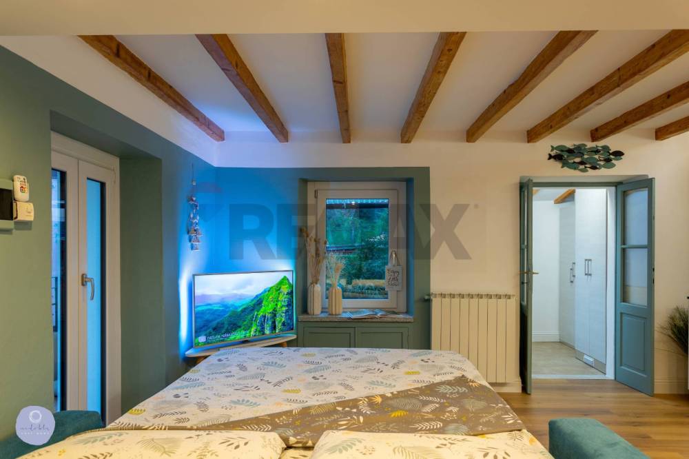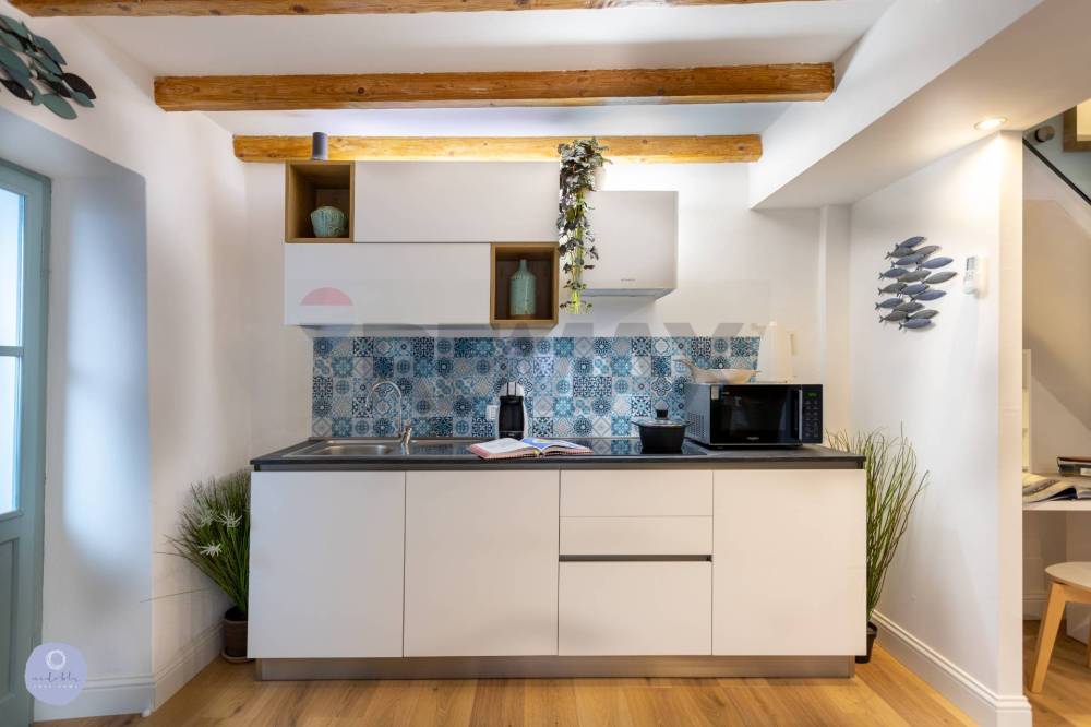 L'accesso alla casa avviene attraverso una comoda rampa di scale in marmo che porta ad una piccola corte esclusiva; una seconda rampa conduce direttamente alla porta d'ingresso che immette nella luminosa zona giorno dotata di moderna cucina a vista con uscita sul terrazzino, dove è possibile pranzare o rilassarsi al sole godendo dalla pace del piccolo borgo; sempre al piano troviamo il comodo bagno con lavabo in pietra ed un ampio box doccia in cristallo temperato.