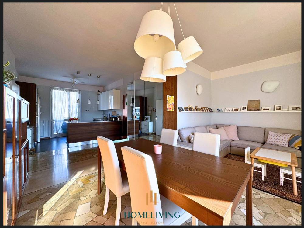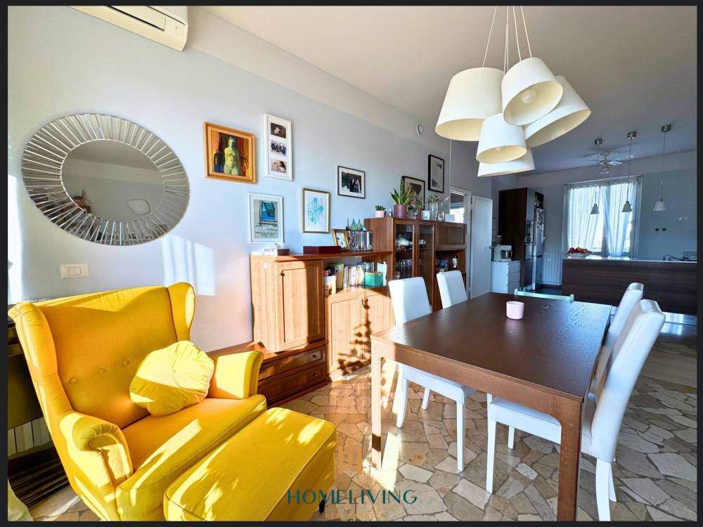 Il soggiorno con cucina a vista, permette di godere di un ottimo spazio aperto che rende un ambiente unico e conviviale, ha la pavimentazione in gress e marmo, gli infissi in alluminio con doppio vetro, garantiscono un'ottima luminosità naturale e una buona efficienza energetica.