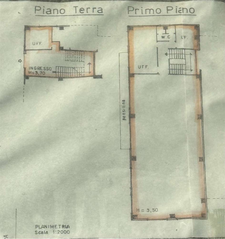 La porzione immobiliare è disposta su due livelli ed è così suddivisa: al piano terra di mq. 55 ca. / h 3,70, ampio ingresso, ufficio, ripostiglio e scala d'accesso al piano superiore di mq 300 ca. / h 3.05, dove troviamo due uffici, un antibagno con due wc, e un grande laboratorio.
