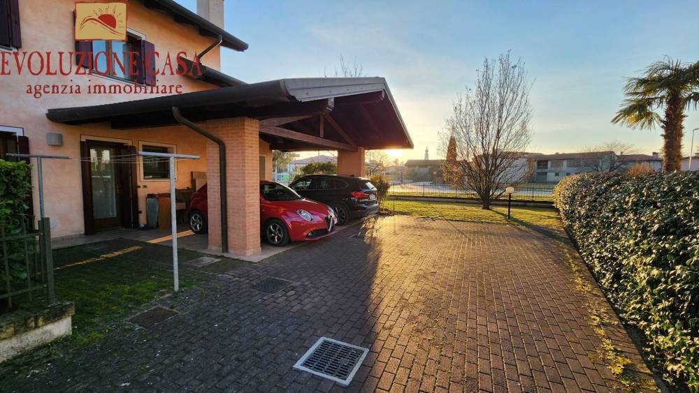 Completano la proprietà un doppio posto auto coperto di 34 mq. il giardino di 300 mq. disposto su 3 lati ed una comodissima cantina di 12 mq. a pochi passi dall'abitazione, che ne valorizza gli spazi.