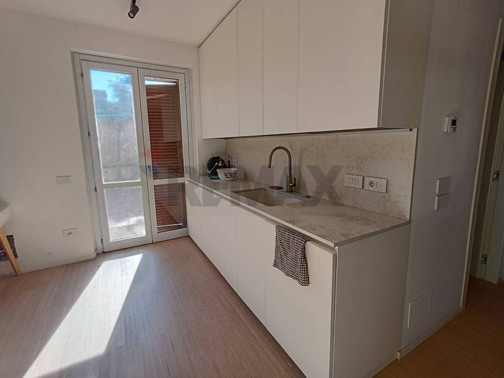 L'appartamento è composto da un ampio luminoso soggiorno, una cucina abitabile aperta a vista sul soggiorno, una camera da letto matrimoniale e un bagno completo di tutti i servizi, con doccia e finestra. A completamento della cucina c'è una lavanderia/stireria/ripostiglio dove è alloggiata la lavatrice.