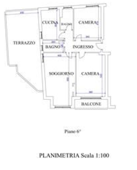 L'alloggio ha superficie netta di 84,60 mq ed altezza interna di tre metri, è così suddiviso: ingresso, due camere da letto, soggiorno, cucina e due bagni, oltre a due terrazzi di cui uno di 35 mq e l'altro di 4,50 mq.