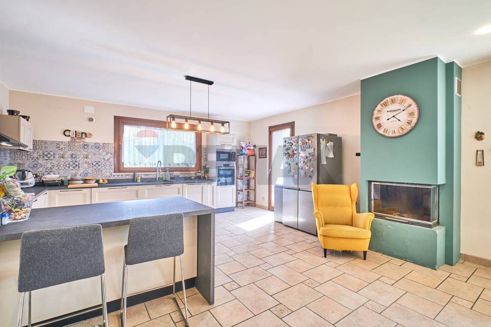 Due grandi vetrate ci permettono di poter ammirare la bellezza del giardino dall’interno della casa, anche in inverno, come se fosse un complemento d’arredo: la piacevole sensazione di spaziosità della zona giorno abbinata alla resa dell’esposizione del sole e alla vista del verde di certo infonde quella gradevole sensazione di benessere che ci mette perfettamente a nostro agio, con il piacere di sentirsi a casa. A ciò si aggiunge l’effetto scenico del Caminetto centrale e delle luci led che ci trasmettono quella calda atmosfera d’accoglienza.