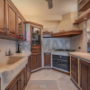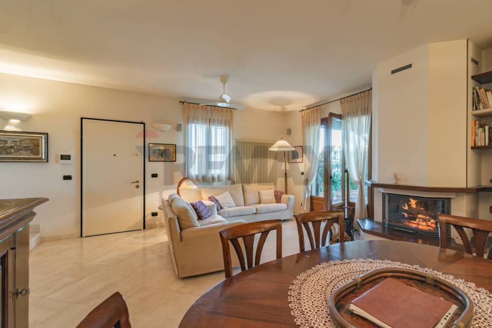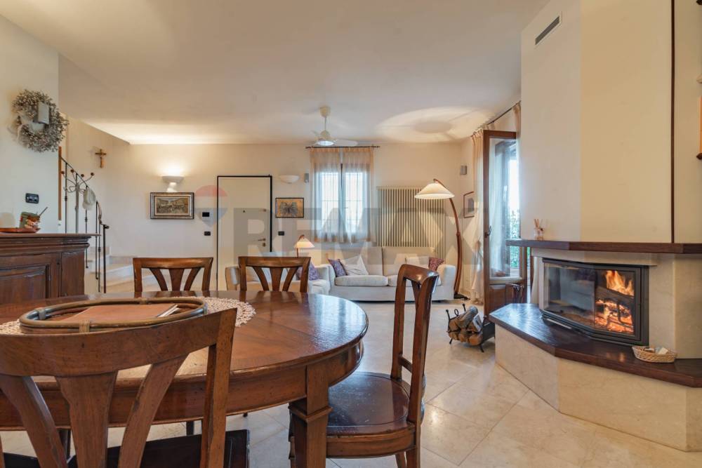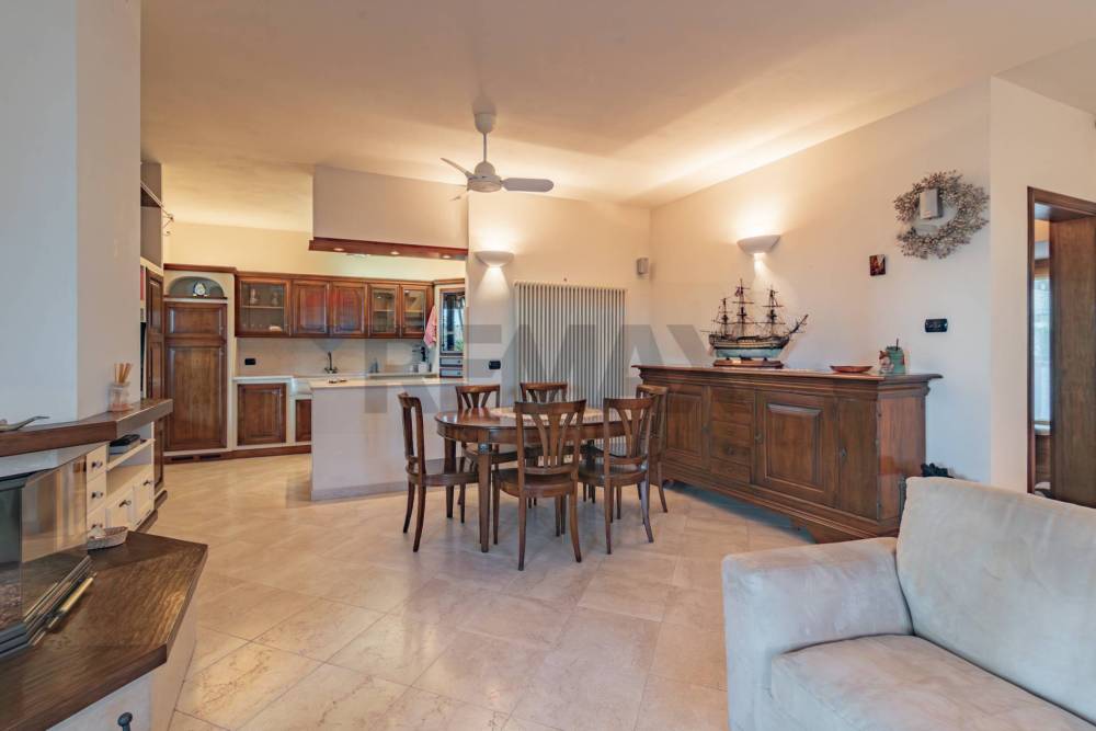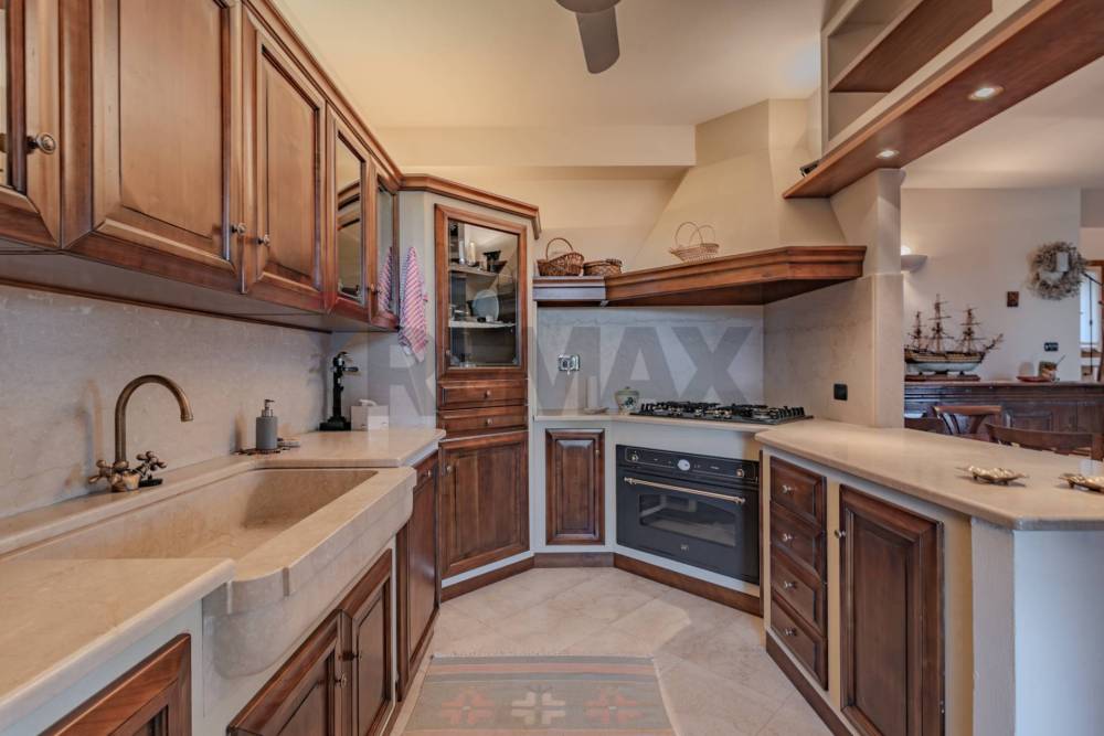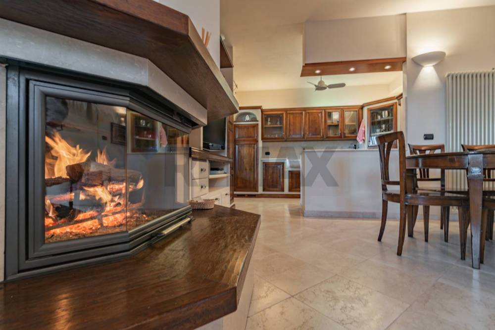 All'interno troverai un'ampia zona living con pavimento in pietra naturale, impreziosita da un termocamino Palazzetti, perfetto per le serate invernali e una cucina Zappalorto in ciliegio e moderna e funzionale con un bellissimo e originale lavandino ricavato da un intero blocco di marmo Botticino, così come il top; la struttura della libreria è in pioppo multistrato indeformabile I tavoli e le sedie Marchetti in vero legno, ante e mobili in legno del '700.