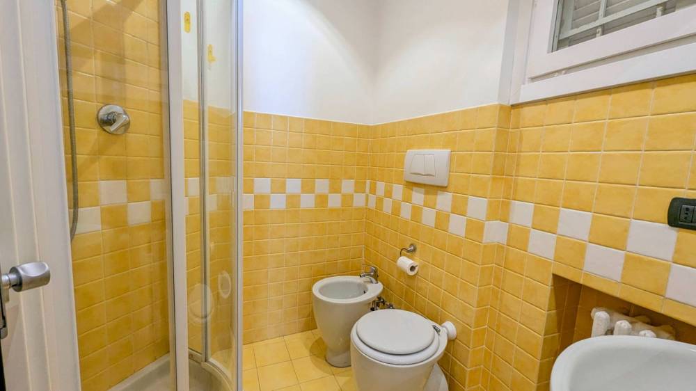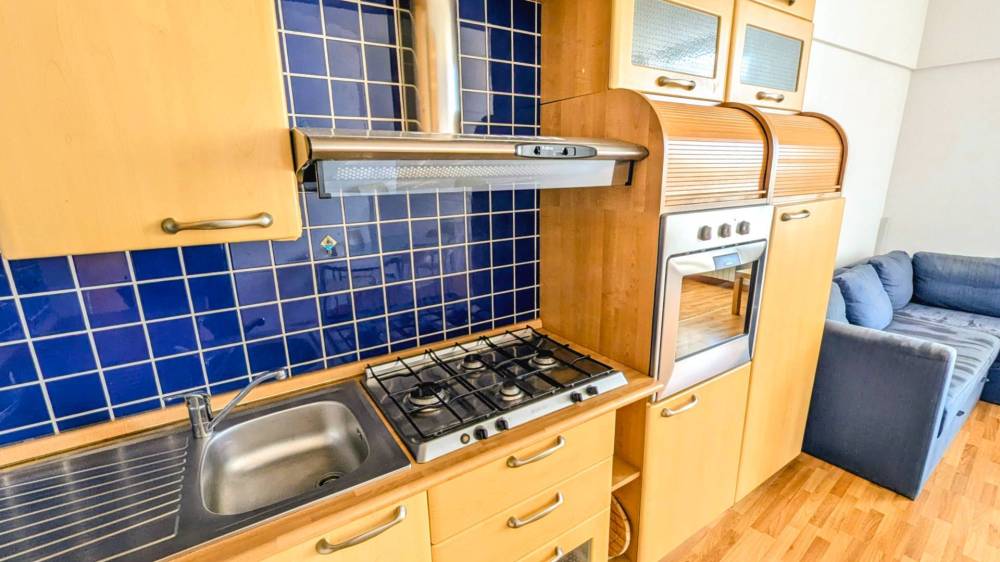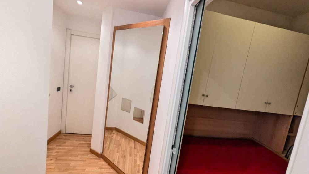 All'appartamento si accede tramite la galleria delle attività commerciali ed una rampa di soli 12 gradini. Una volta in casa si è accolti dall'ingresso a corridoio che distribuisce le due camere, una matrimoniale ed una singola con possibilità di aprire un secondo letto singolo, ed il bagno finestrato. Di testa al corridoio troviamo il grande tinello con cucina completa a vista.